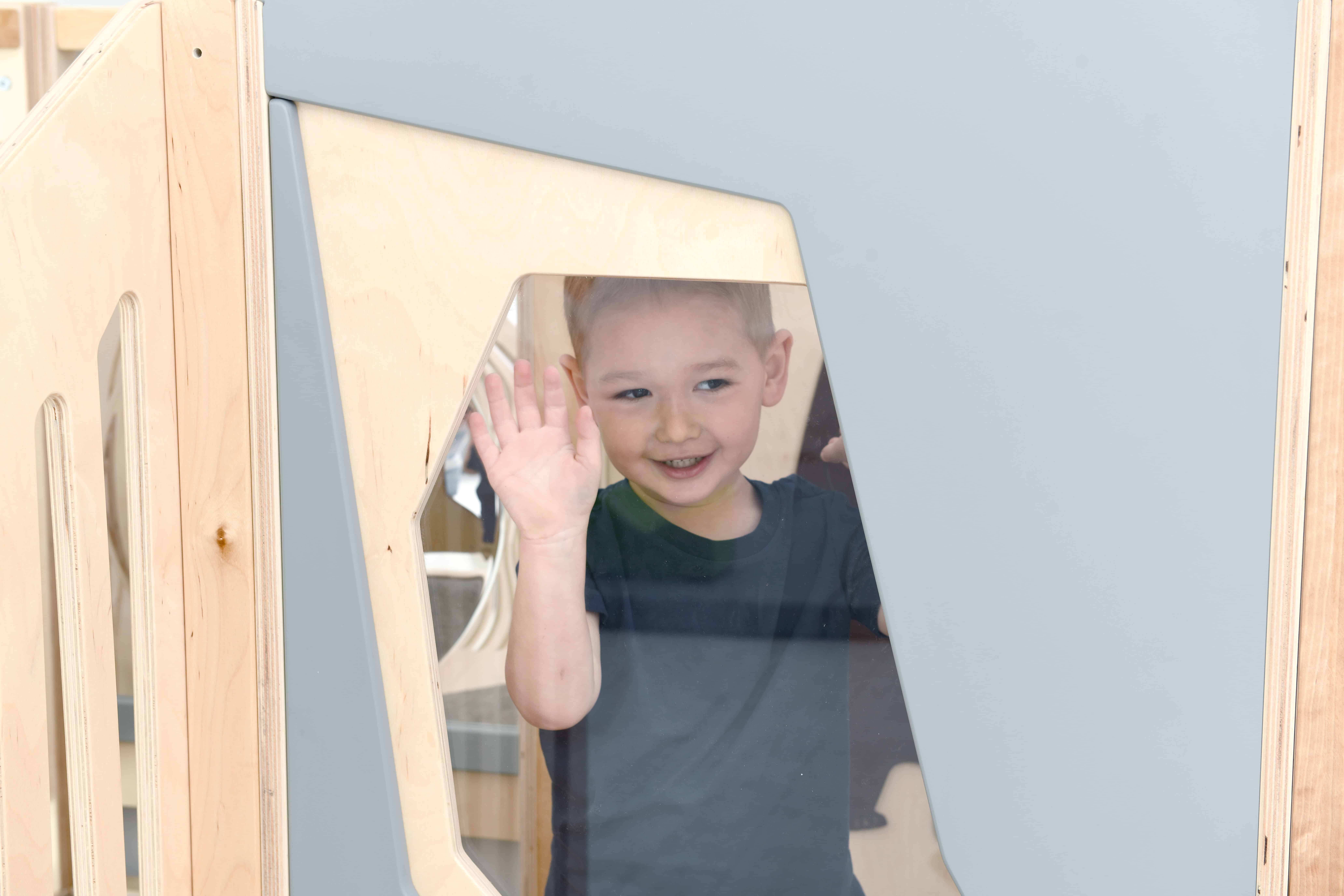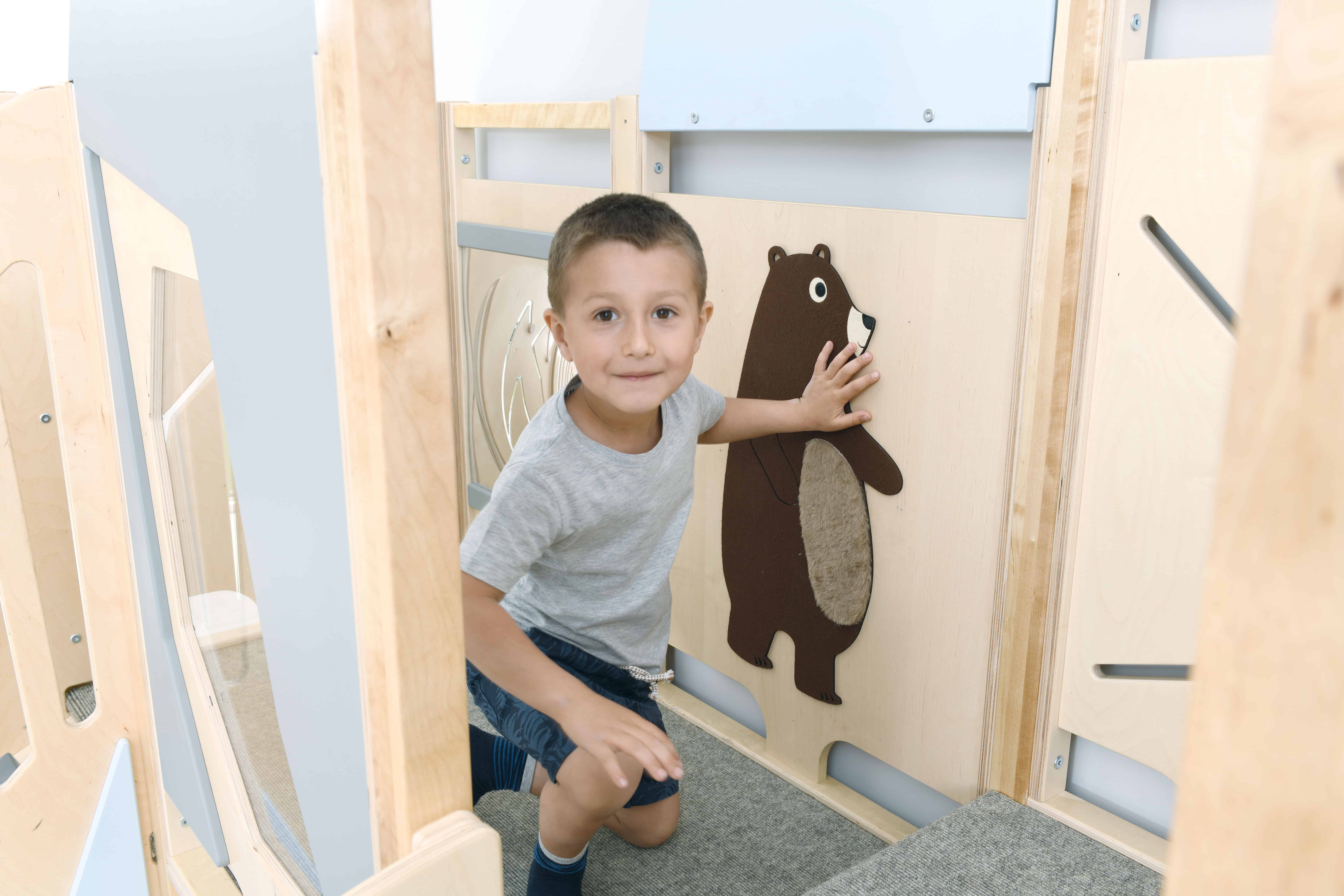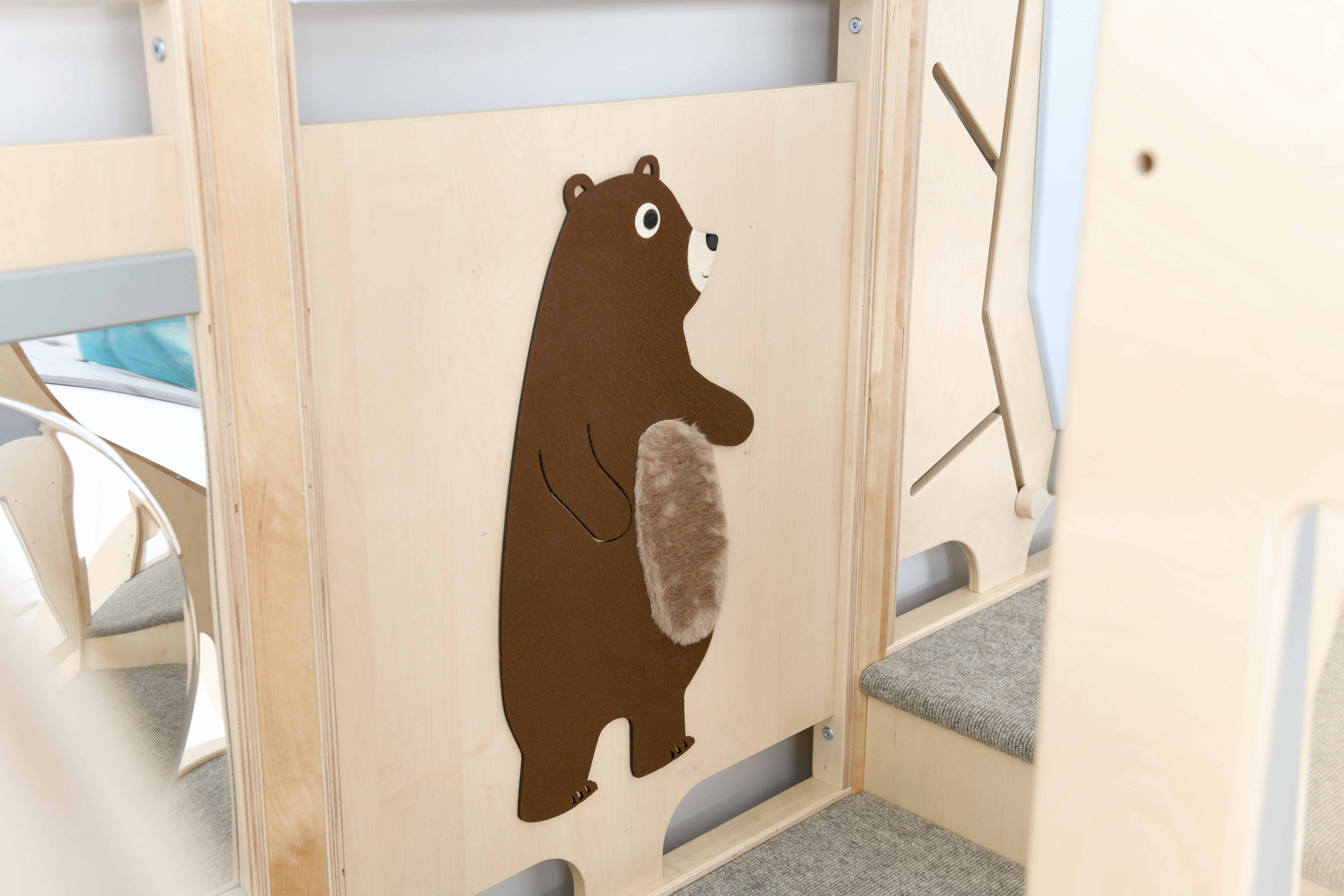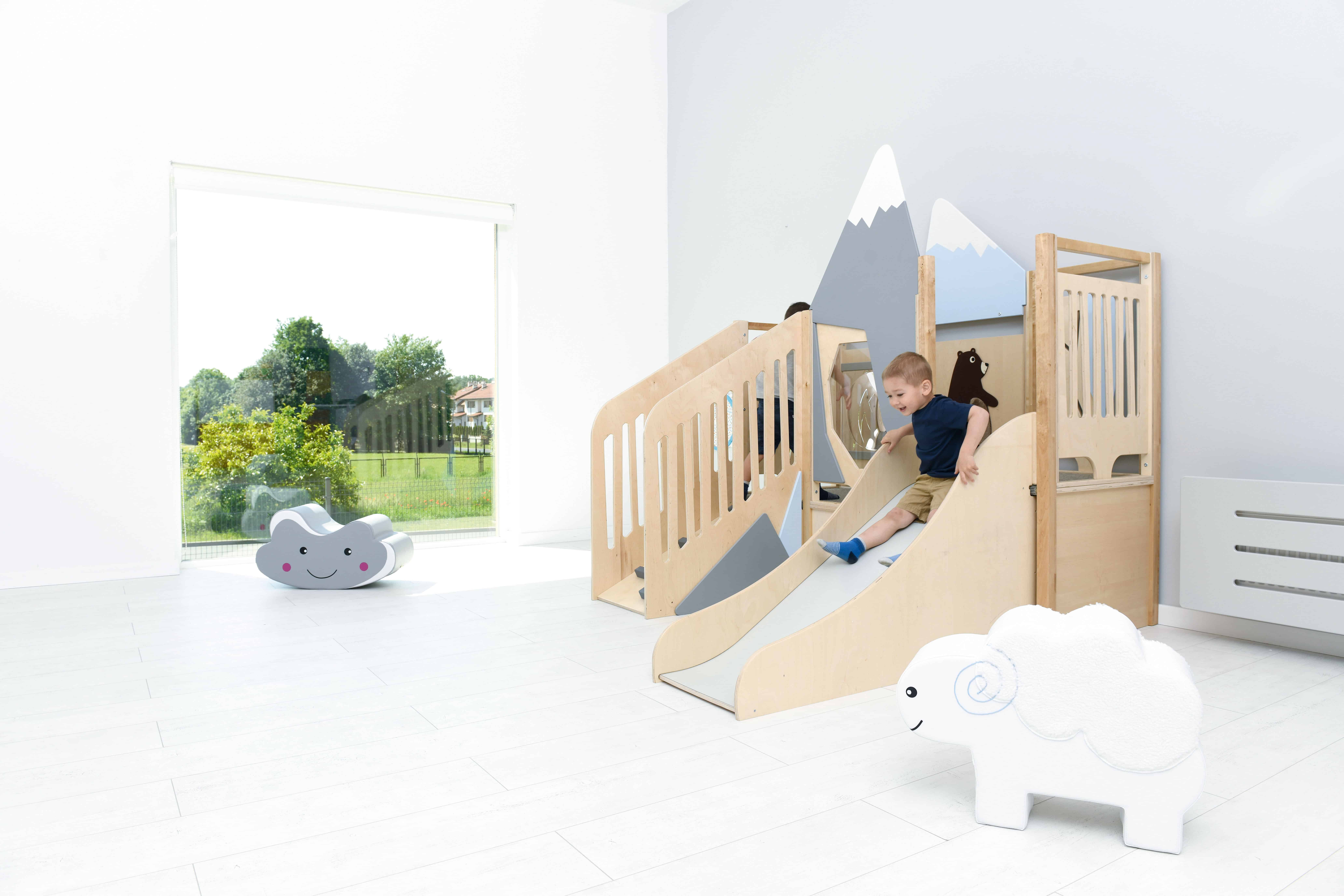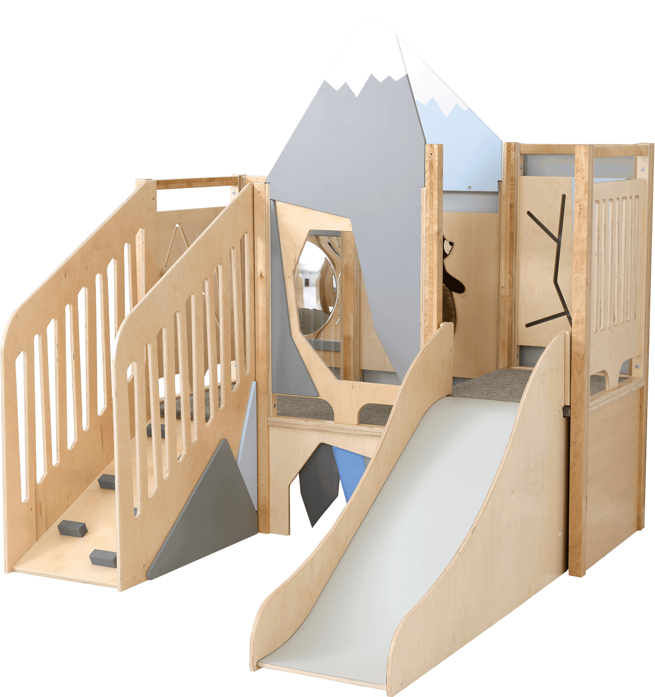 Stort legehjørne med alpetema. Lavet i laminat og finér. Alle platforme er beklædt med skridsikkert tæppe. Indeholder blandt andet et stort spejl, en hule i bunden og en hyggelig bjørn.