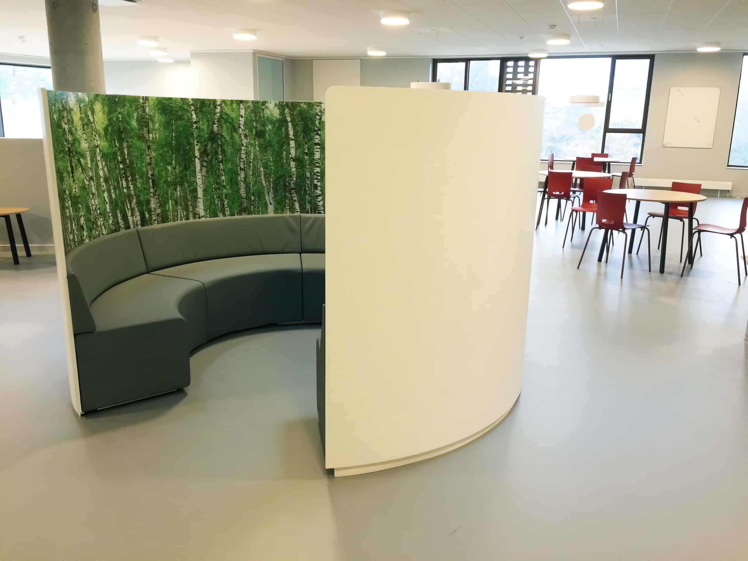 Stor sofa med afskærmning. Perfekt til store gangarealer eller aulaer, hvor de kan benyttes til gruppearbejde. Kan leveres med whiteboard overflader, eller med foliedekoration. Kan leveres i forskellige typer tekstiler, samt i lavere udgaver. Kontakt os for mere information.