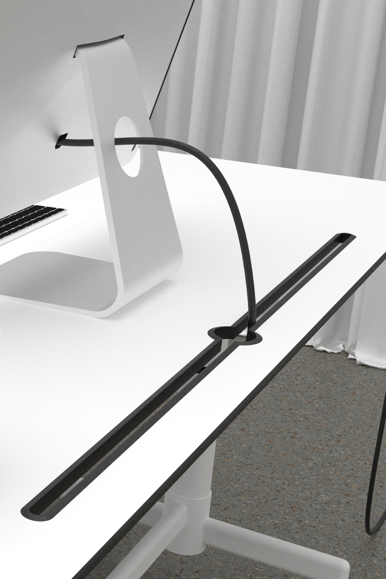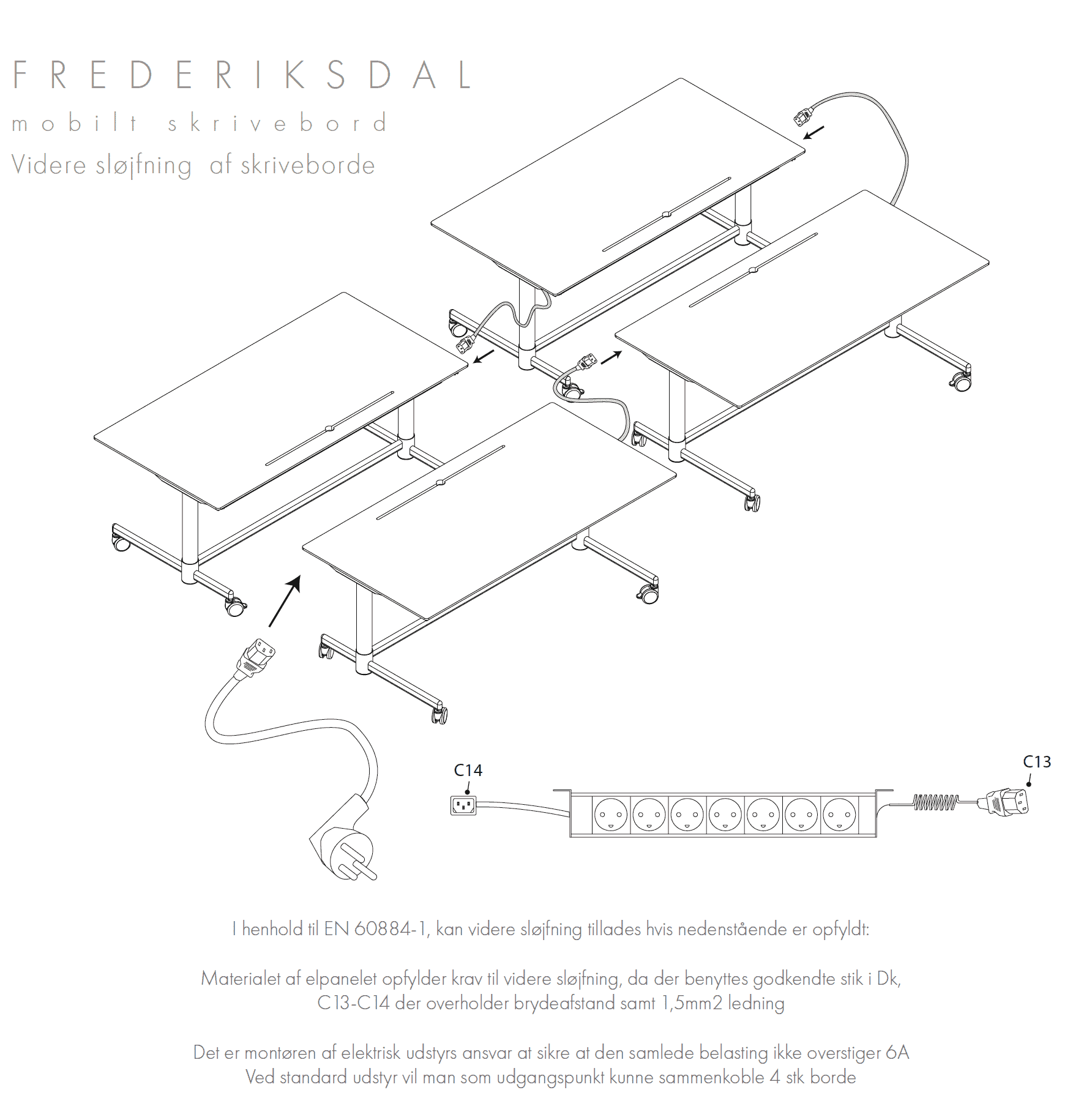 For at gøre det hele endnu nemmere, kan skrivebordet monteres med en smart elskinne med 7 stik, der gør det muligt at sætte op til 4 skriveborde sammen i en “sløjfe”, hvorfor der kun er behov for en enkelt ledning til stikkontakt i væggen. (Tilkøb!) Herudover kan der tilkøbes kabelbakke og skuffe.