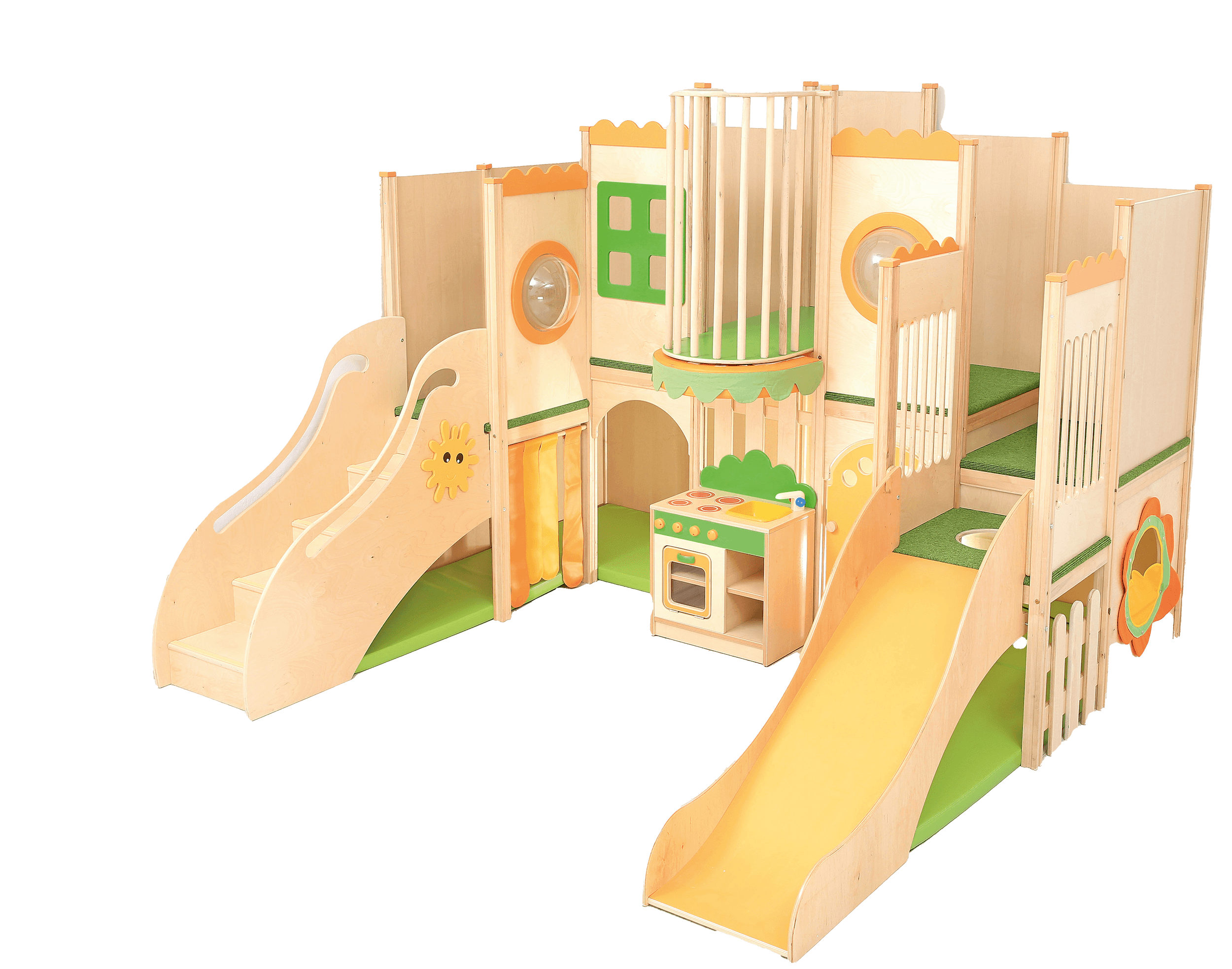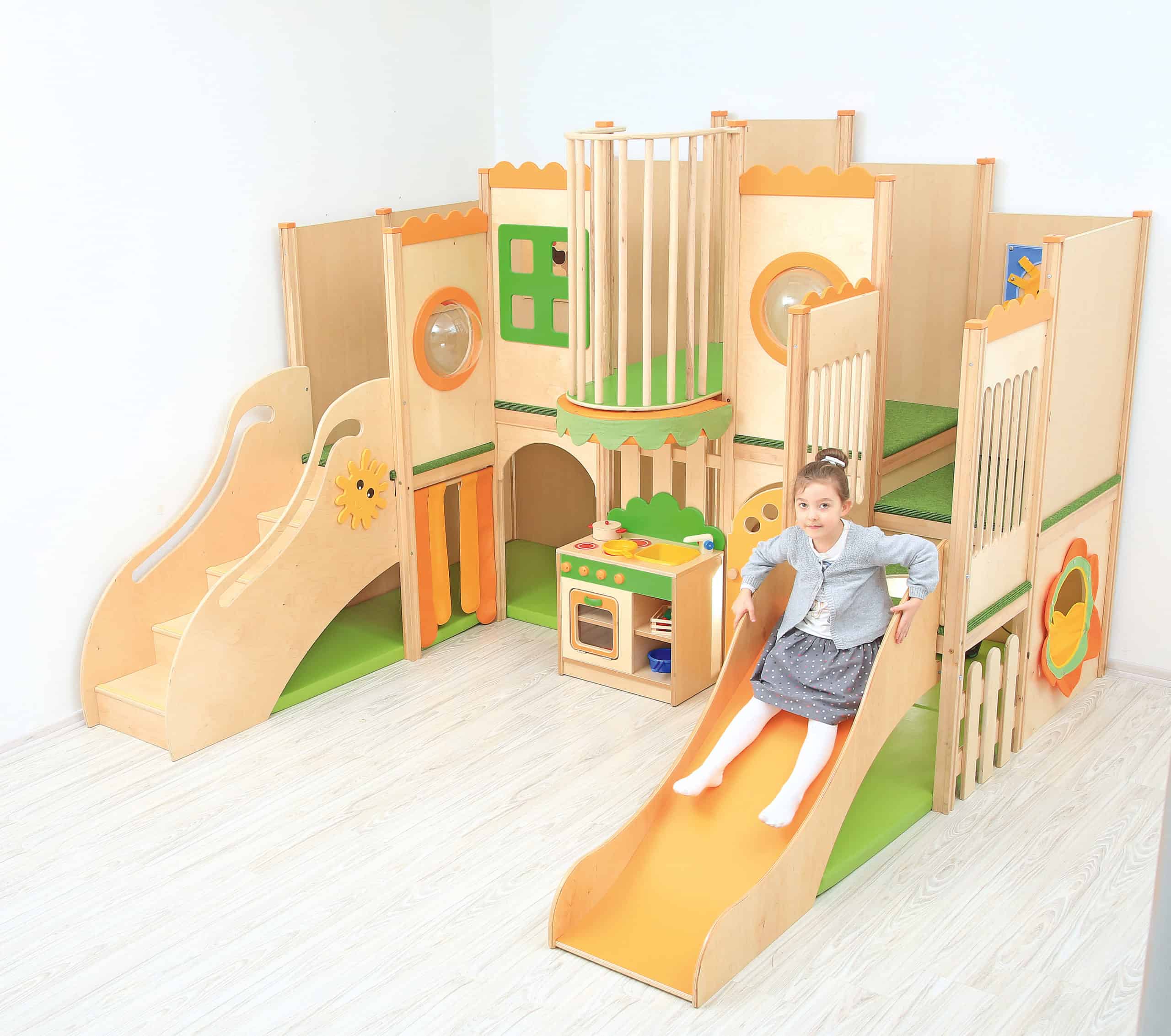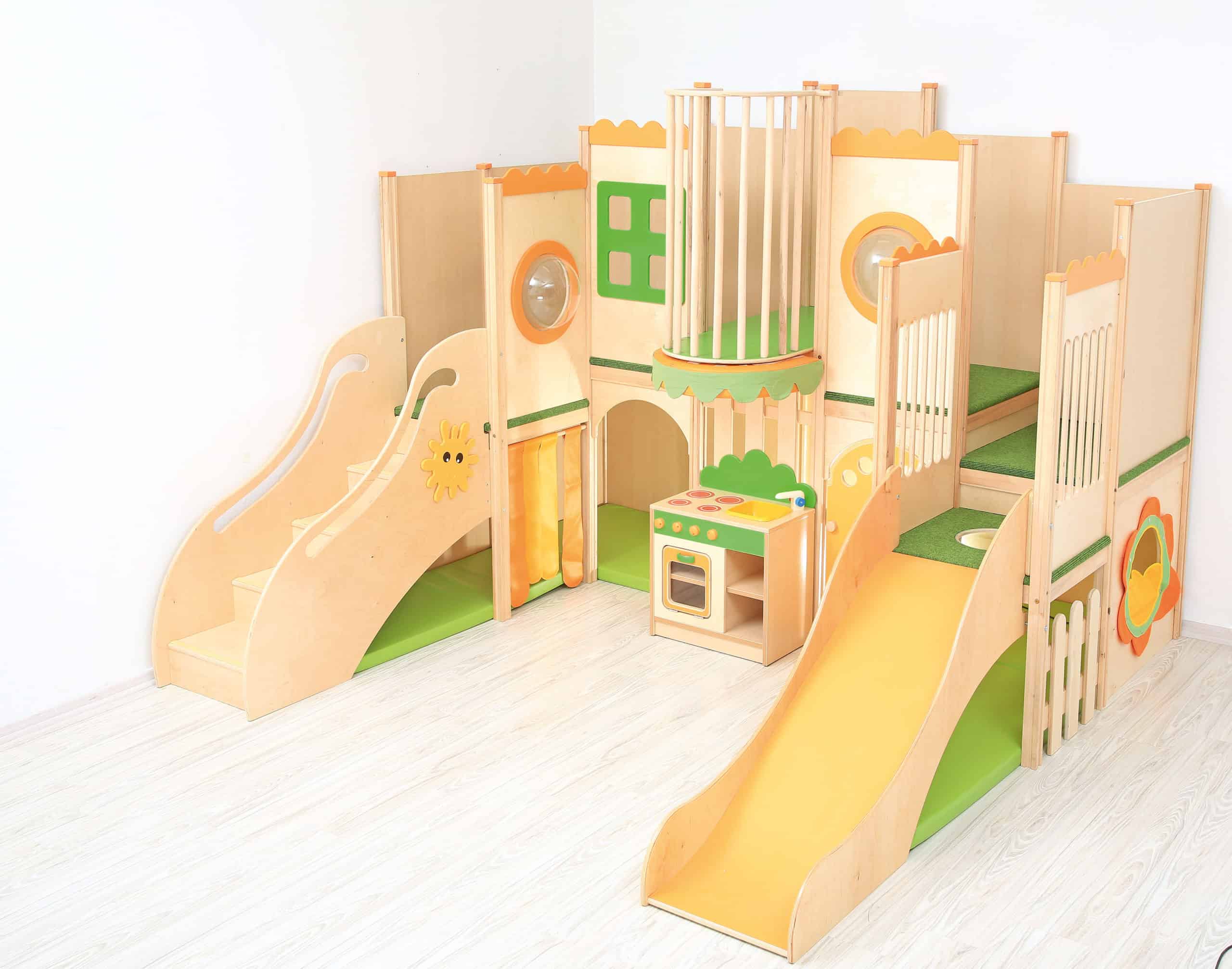 Stort legehjørne med masser af plads til leg. Legehjørnet er i 2 niveauer og er udstyret med rutsjebane og trappe, legekøkken, plexiglasvinduer, altan, flere huler samt sanse- og aktivitetselementer. Alle platforme er beklædt med skridsikkert tæppe for børnenes sikkerhed og madrasser på gulvet for komfort. Leo Legehjørne er lavet i laminat og krydsfinér.