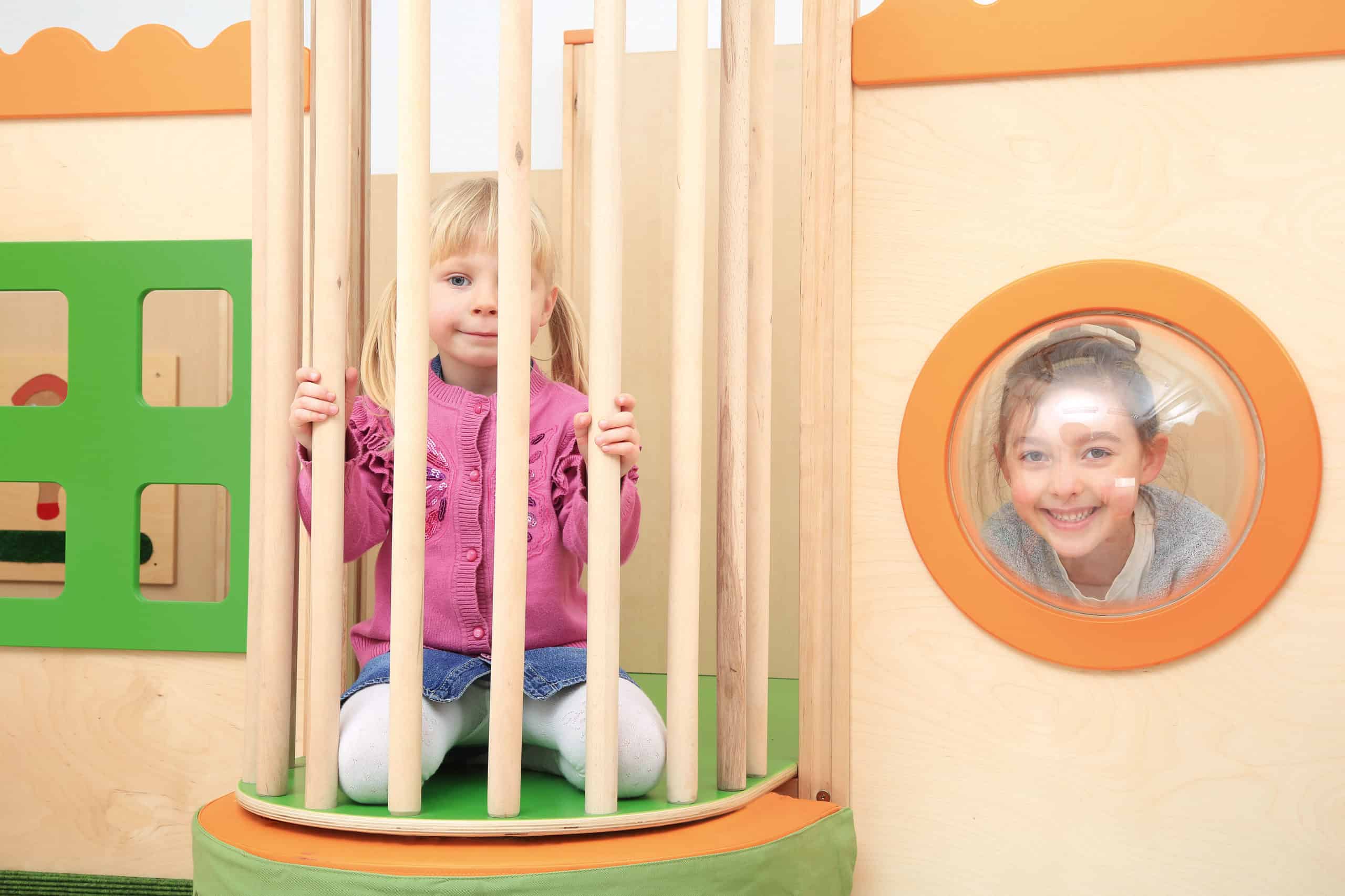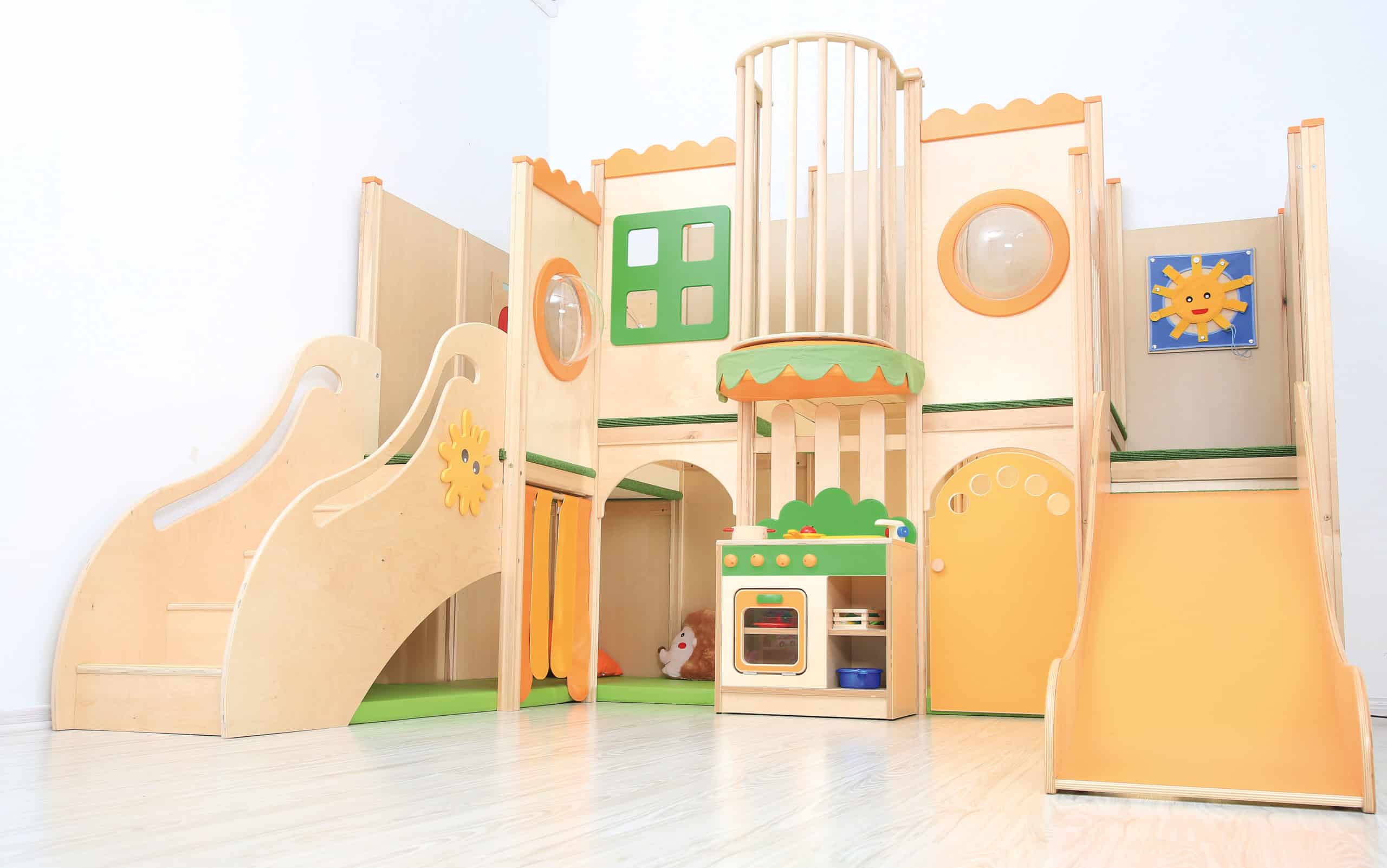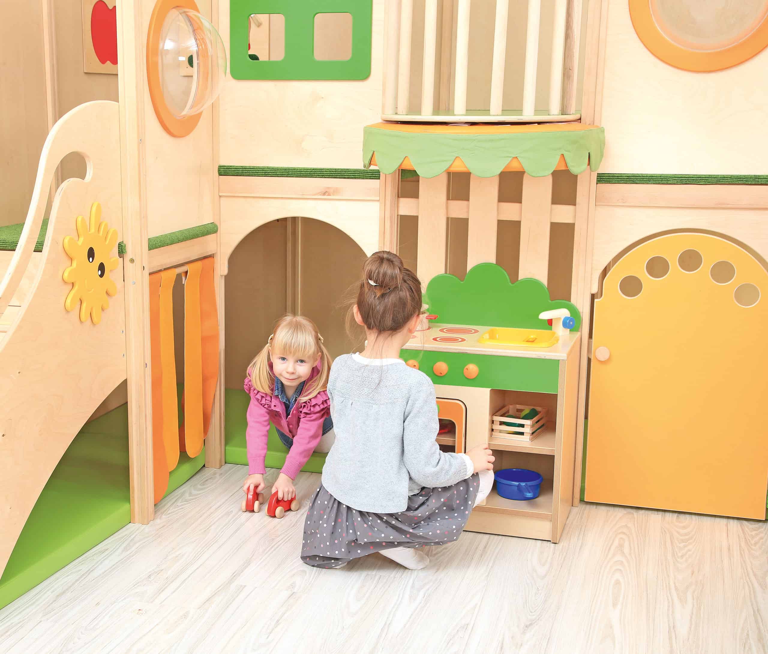 Stort legehjørne med masser af plads til leg. Legehjørnet er i 2 niveauer og er udstyret med rutsjebane og trappe, legekøkken, plexiglasvinduer, altan, flere huler samt sanse- og aktivitetselementer. Alle platforme er beklædt med skridsikkert tæppe for børnenes sikkerhed og madrasser på gulvet for komfort. Leo Legehjørne er lavet i laminat og krydsfinér.