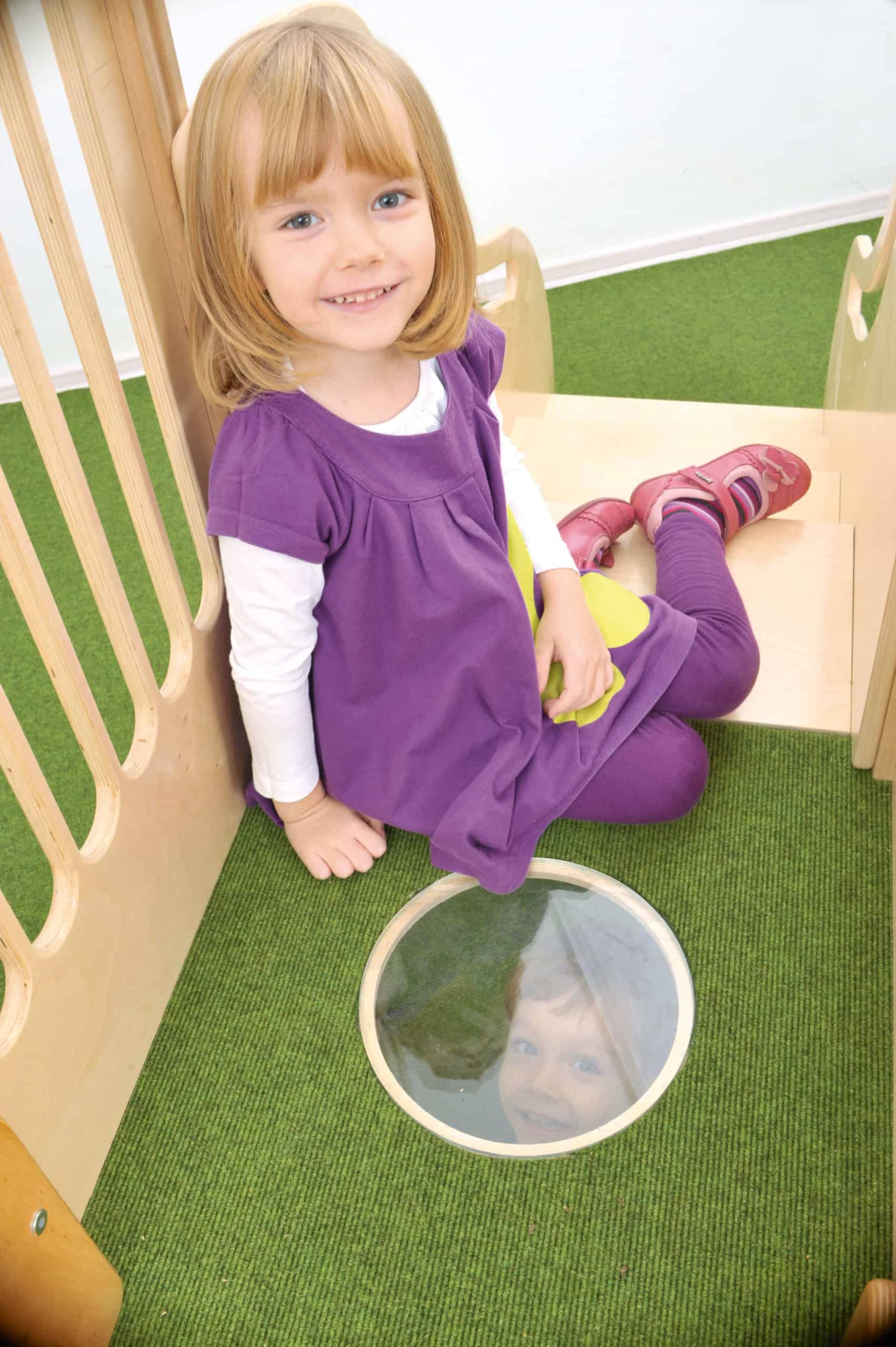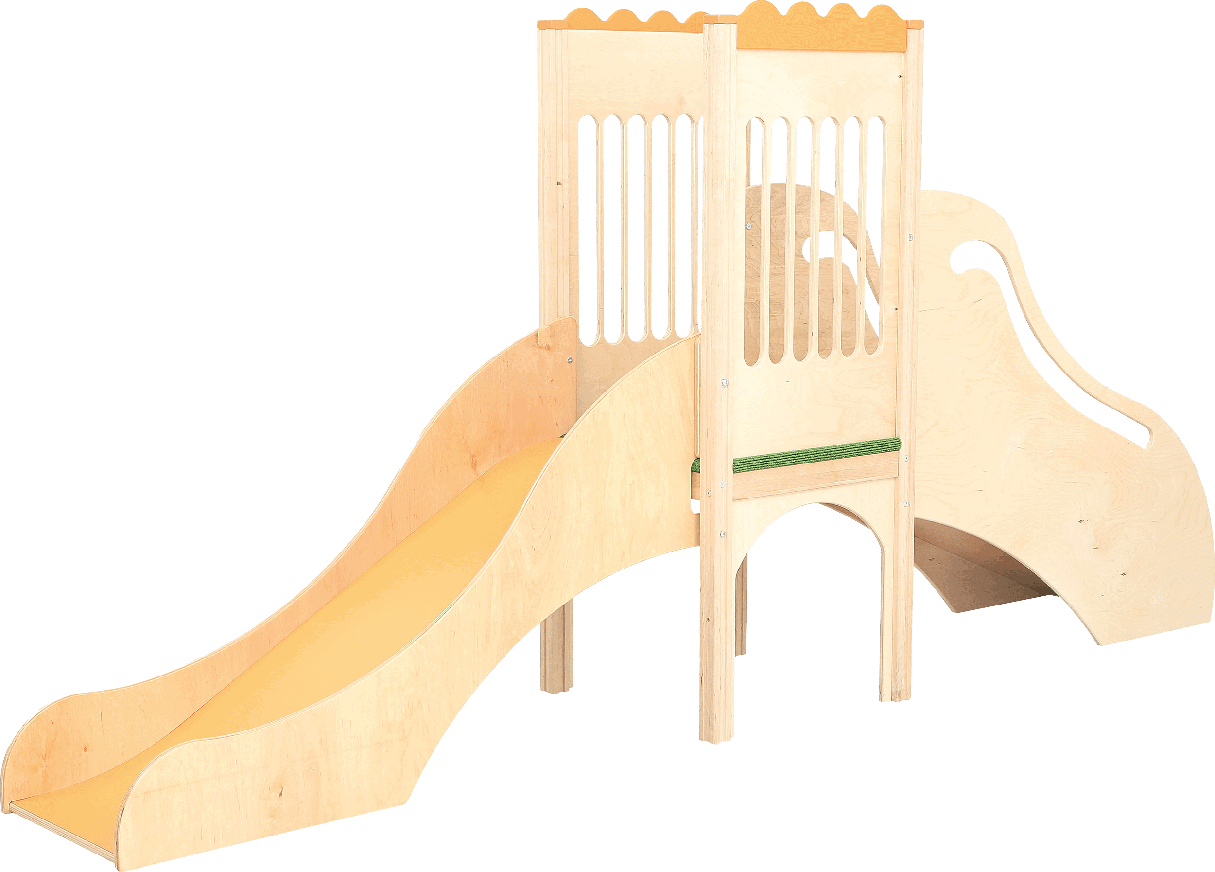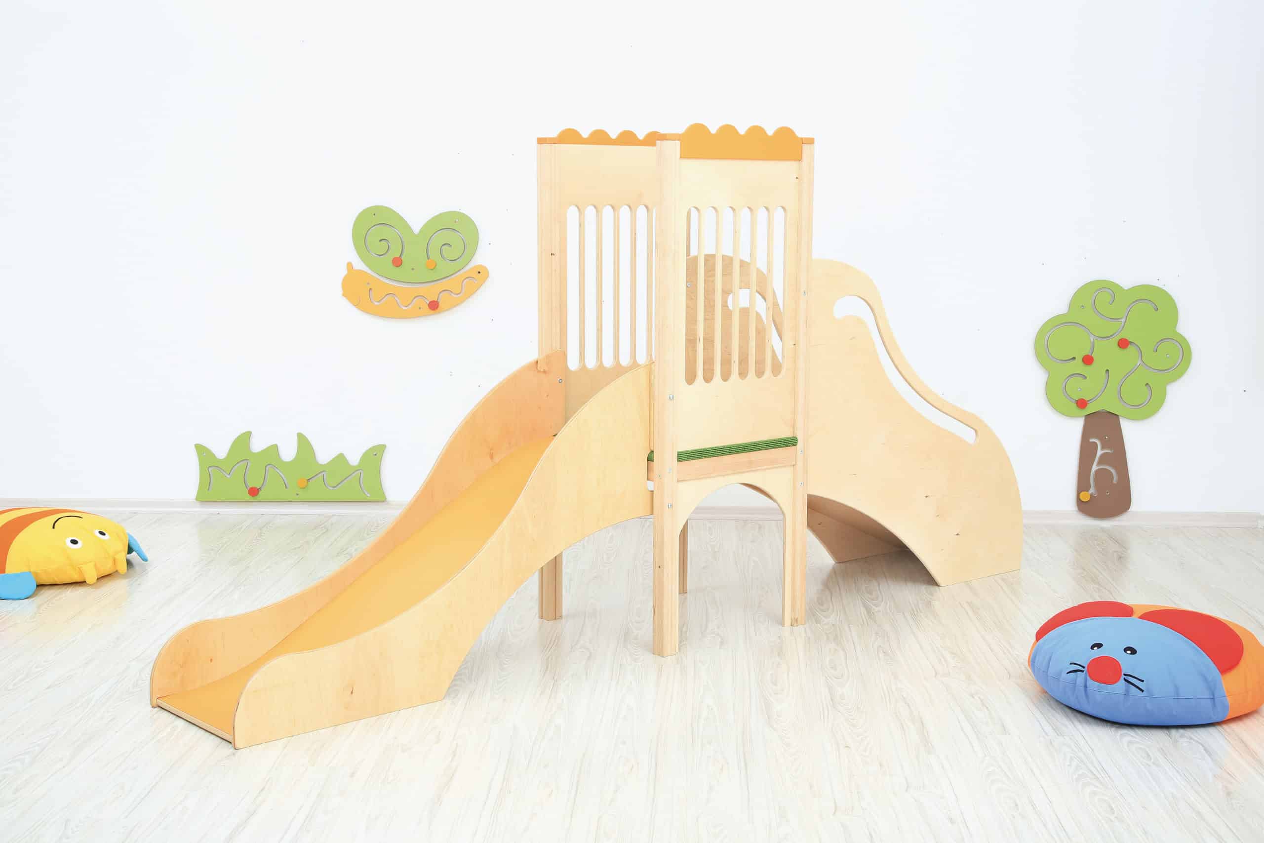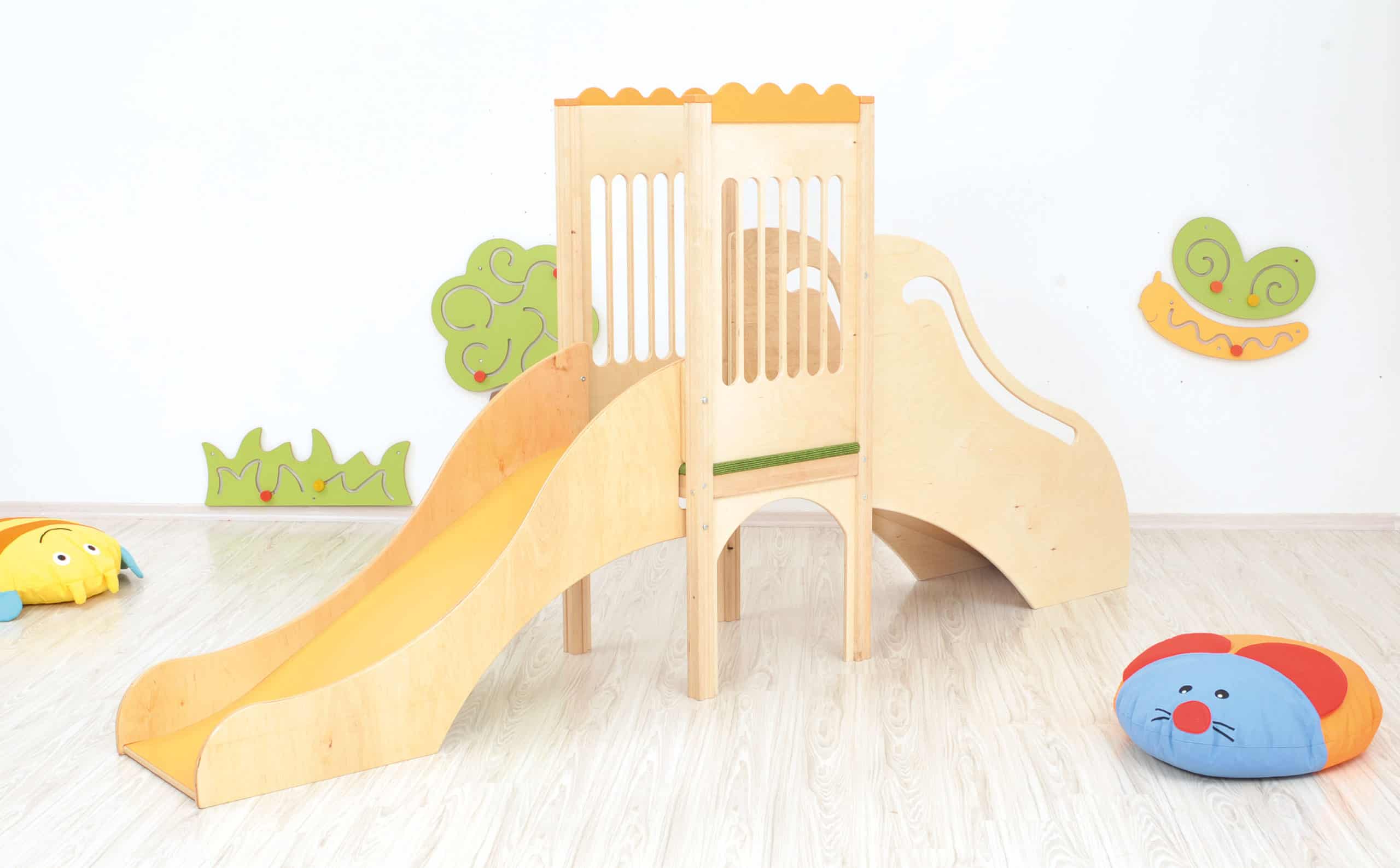 Lille legehjørne med rutsjebane. Den børnevenlige trappe med gelænder fører op til et plateau, med tremmesider og skridsikkert gulvtæppe samt et lille vindue i gulvet, som børnene kan kigge igennem. Herfra har børnene frit udsyn over lokalet inden de kan tage den sjove tur ned ad rutsjebanen.