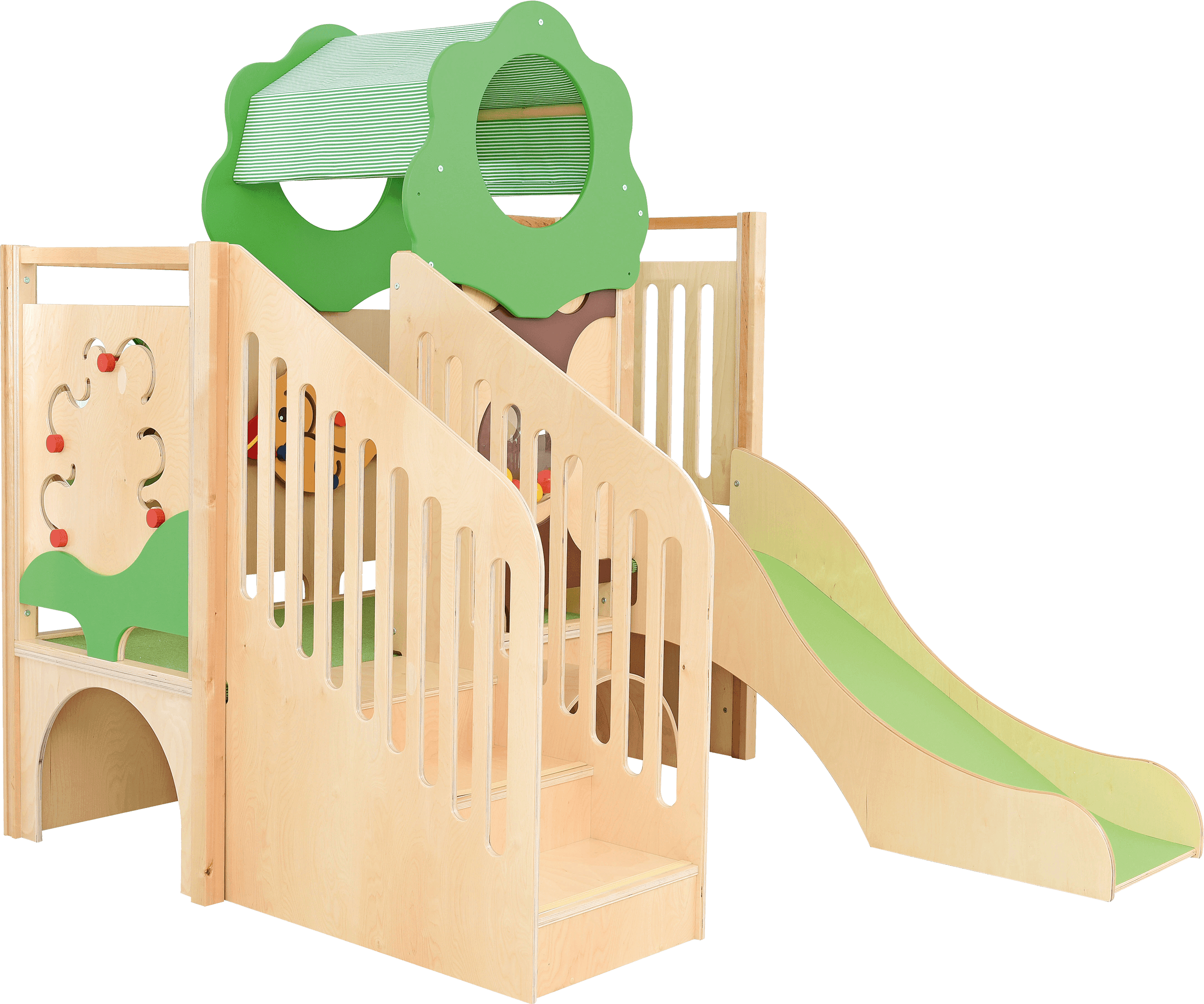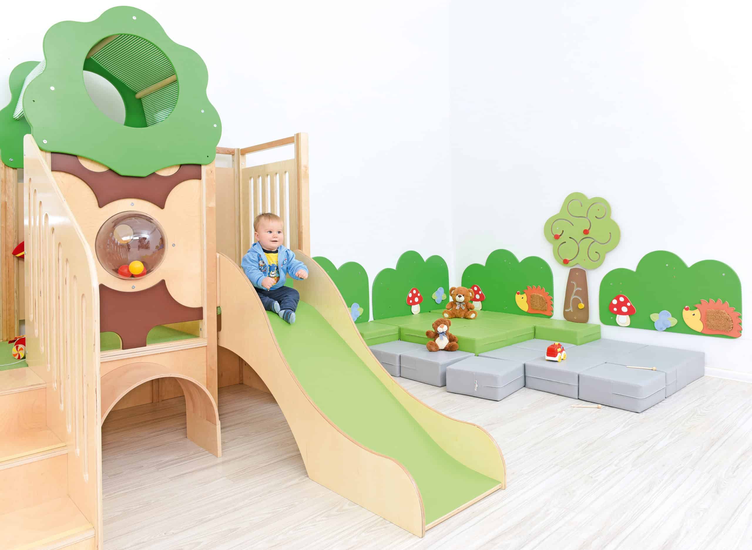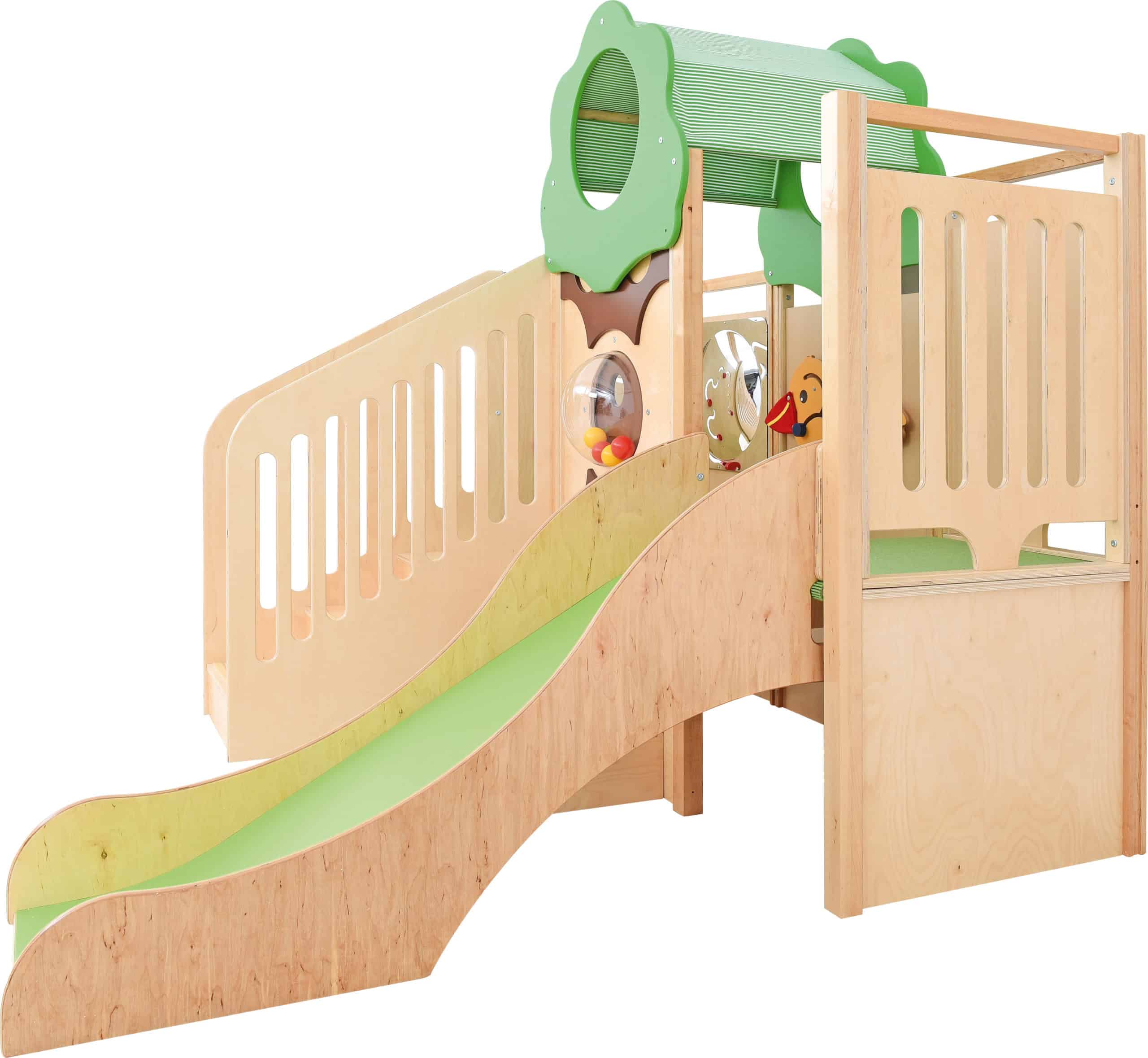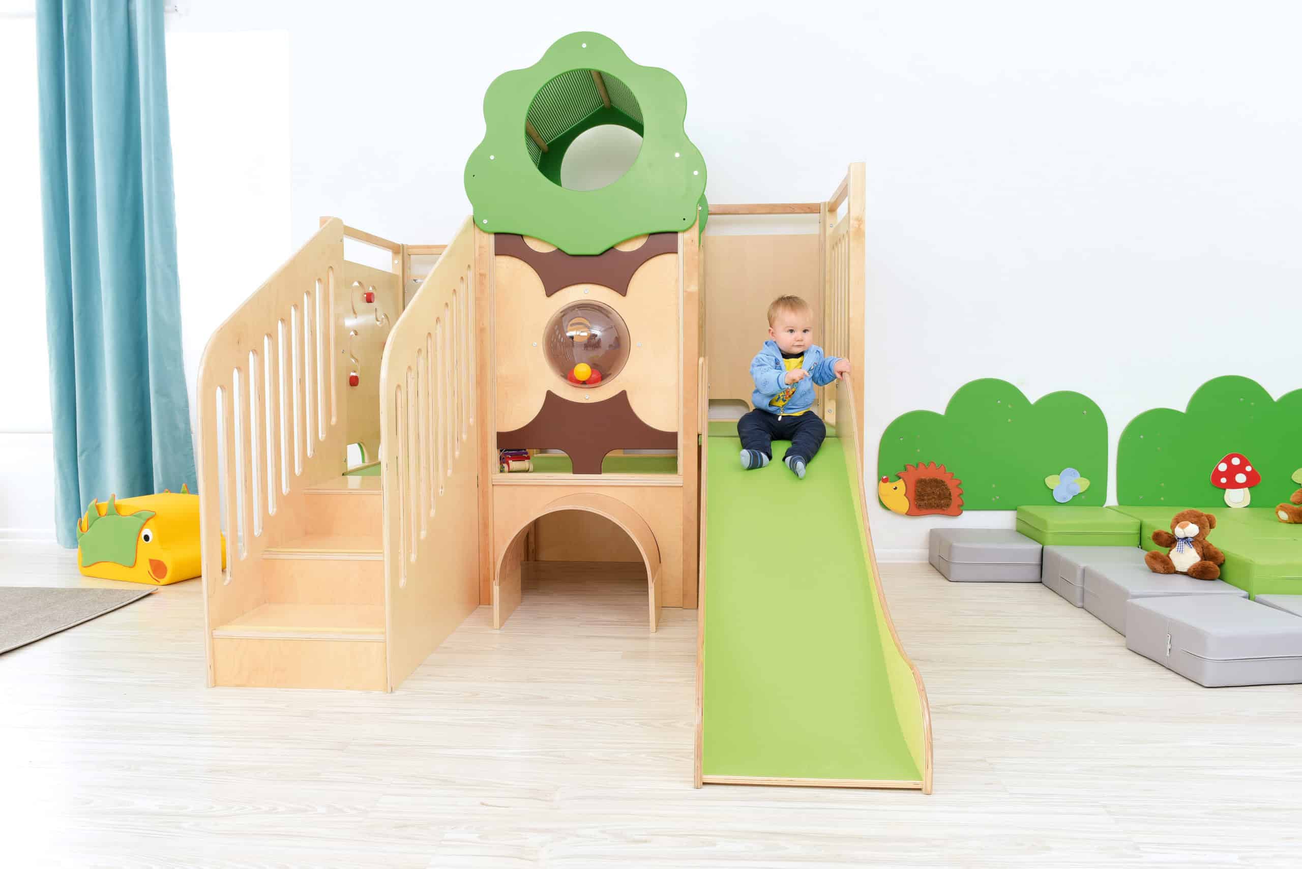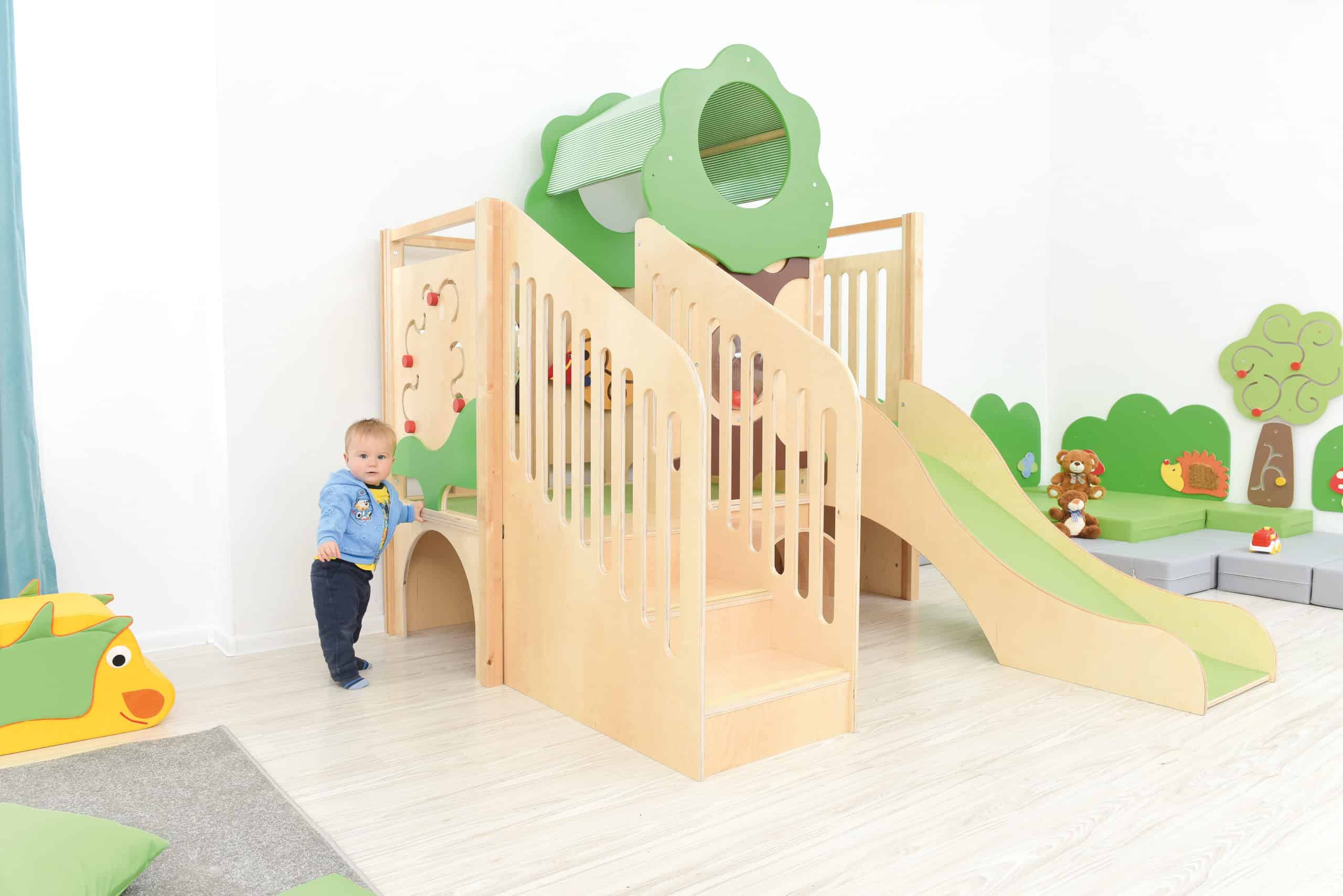 Stort legehjørne med skovtema. Lavet i laminat og finér. Alle platforme er beklædt med skridsikkert tæppe. Indeholder blandt andet et stort spejl og en hule i bunden.