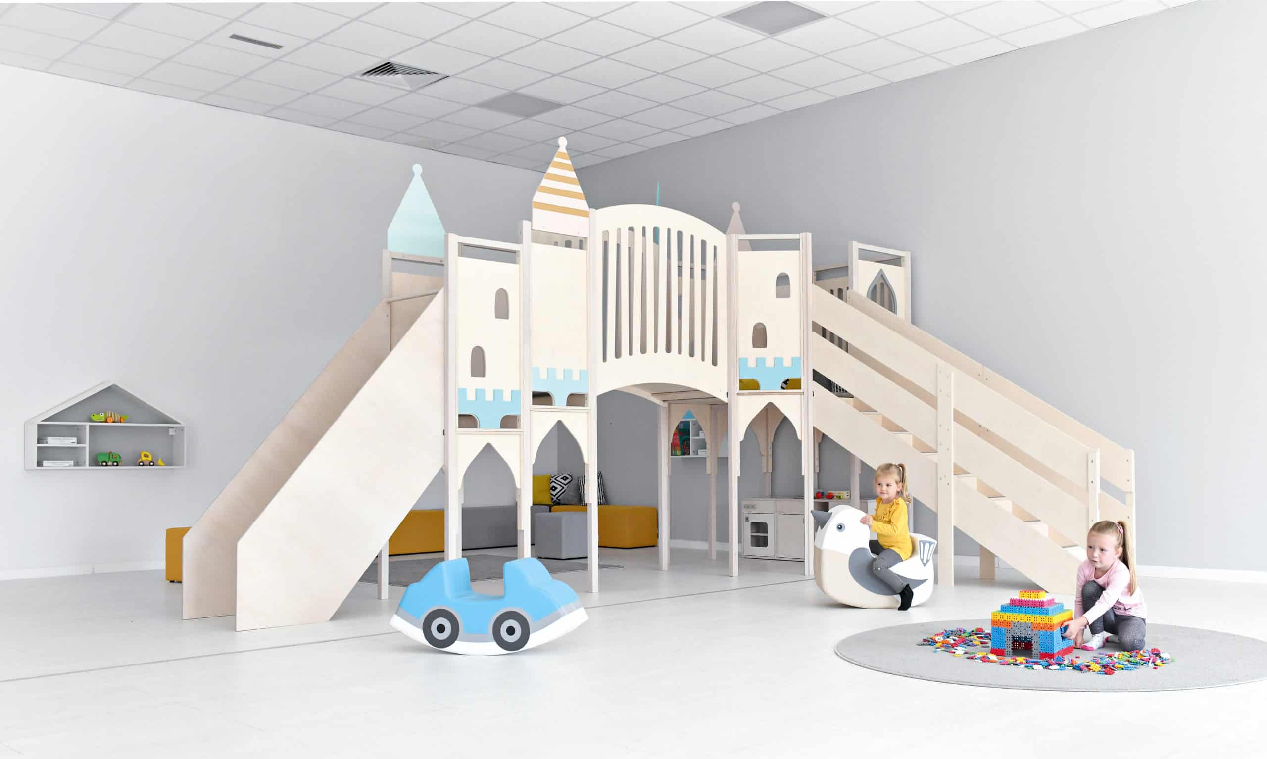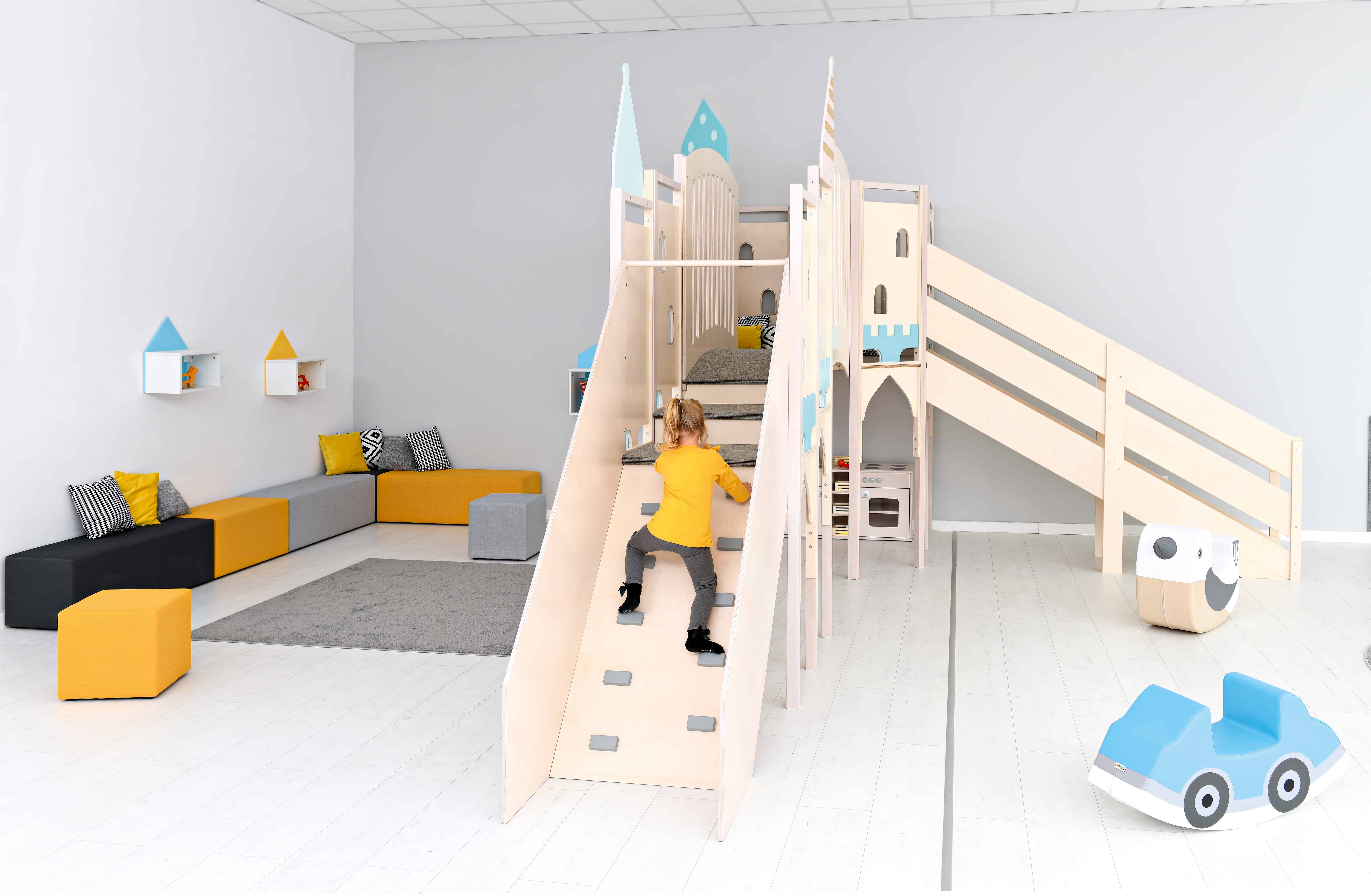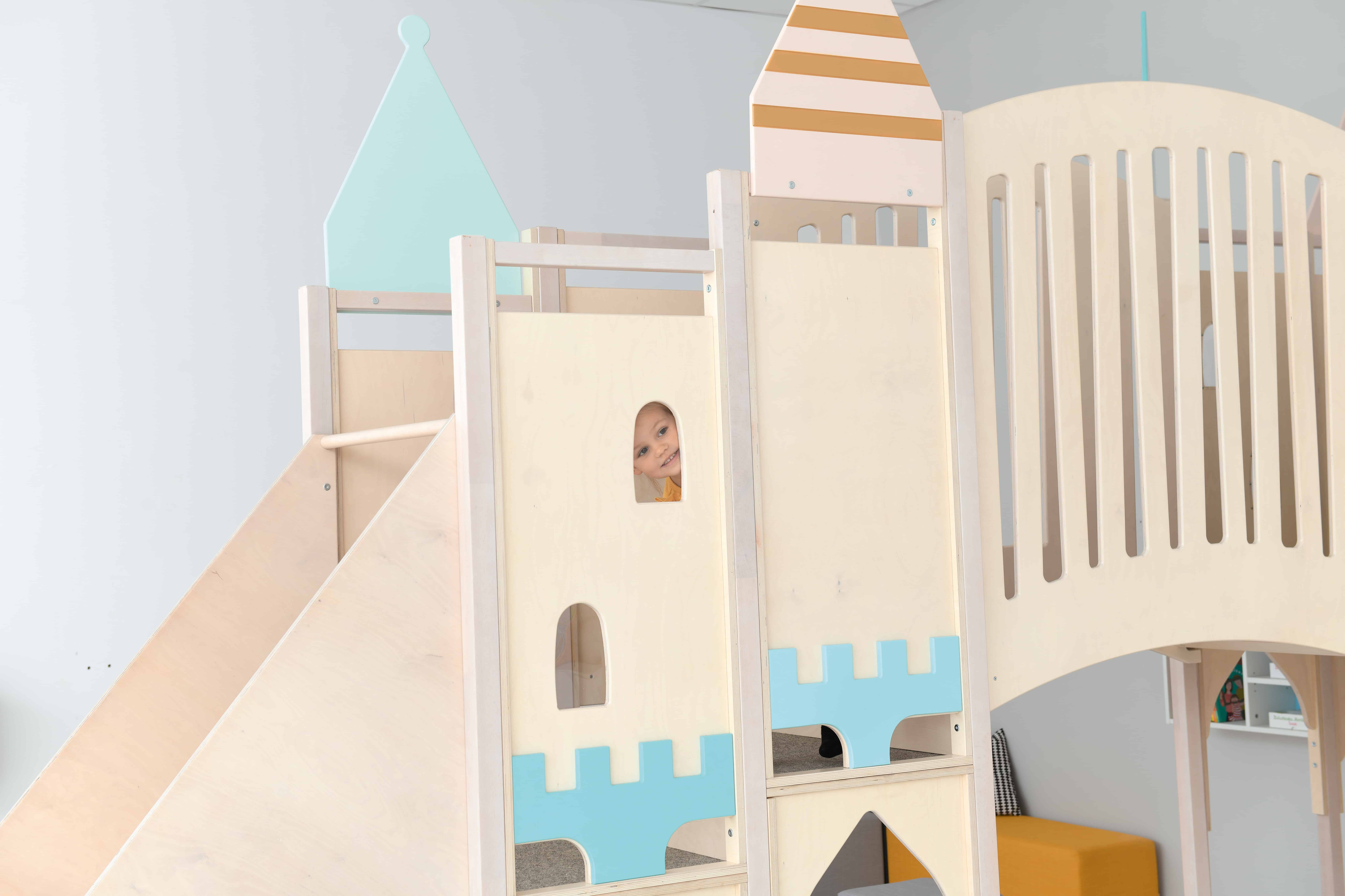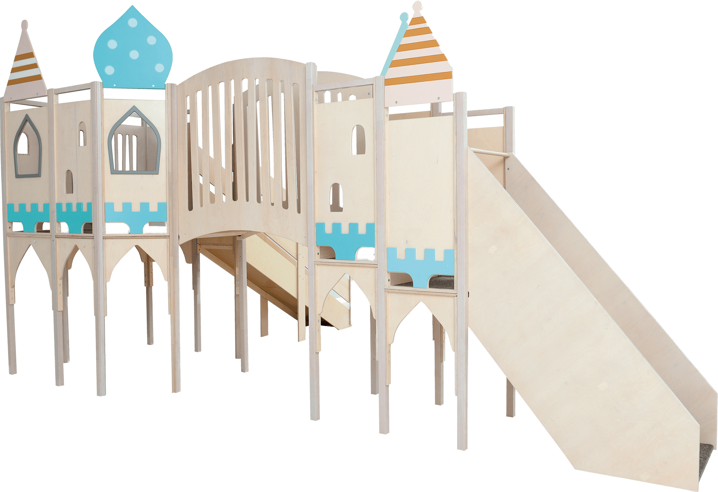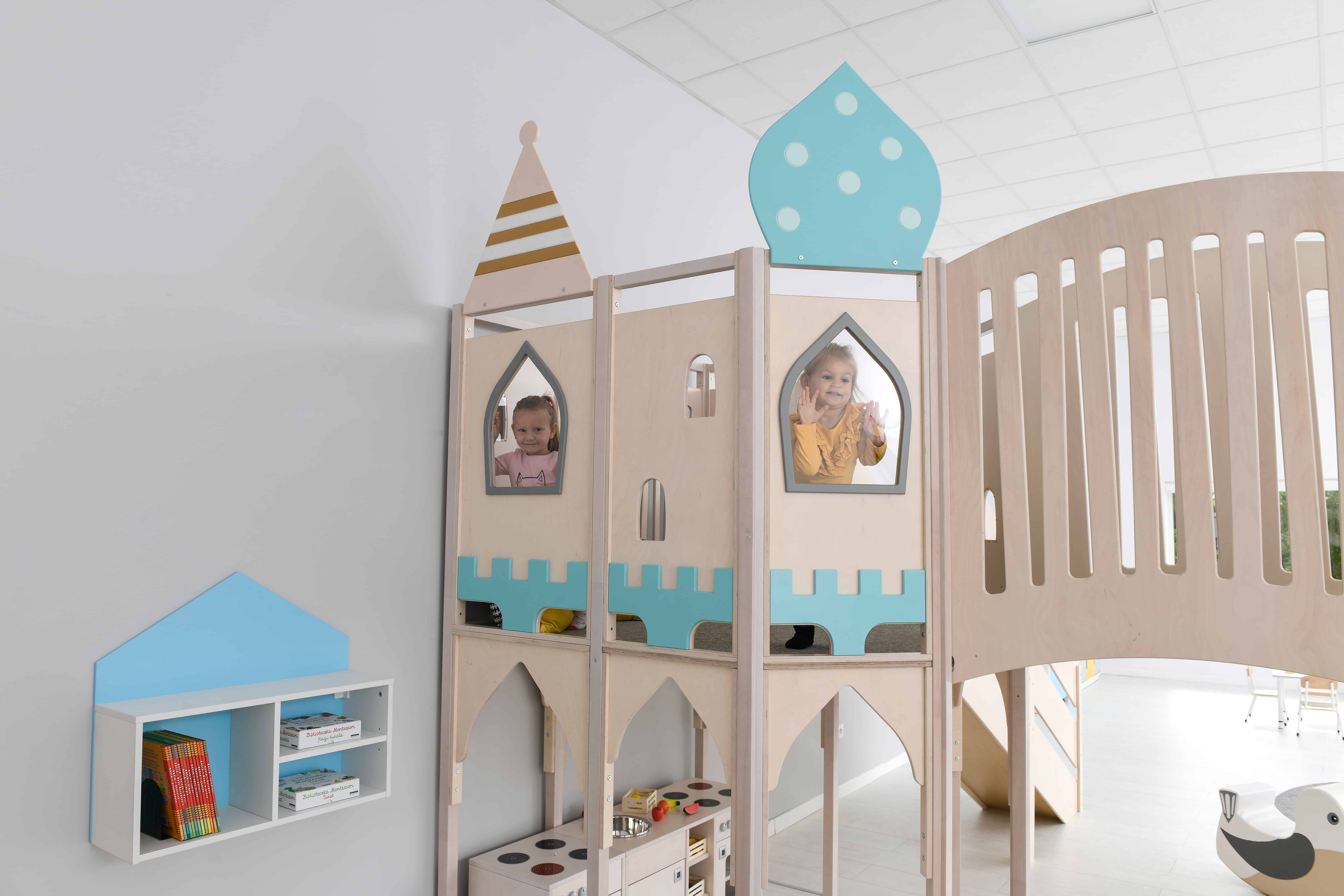 Stort legehjørne formet som et slot, der inspirerer til leg som modige riddere og prinsesser. Lavet i laminat og finér. Med skidsikre overflader på gulvene og trappe.