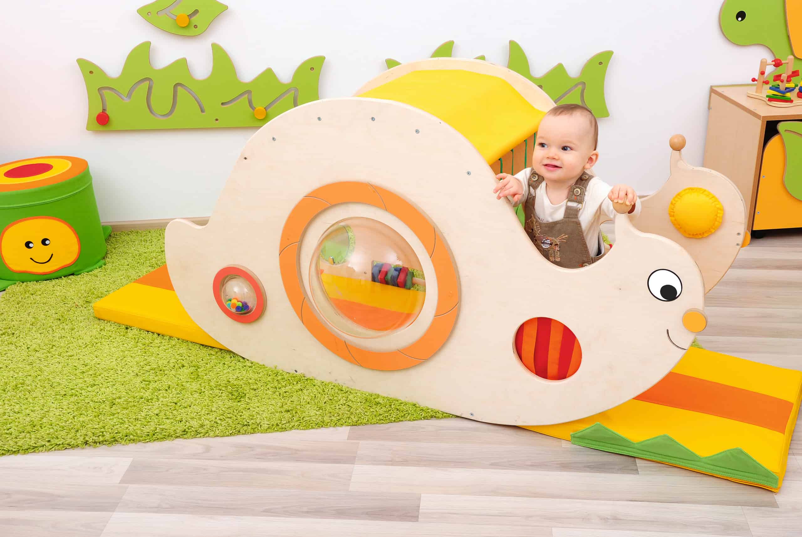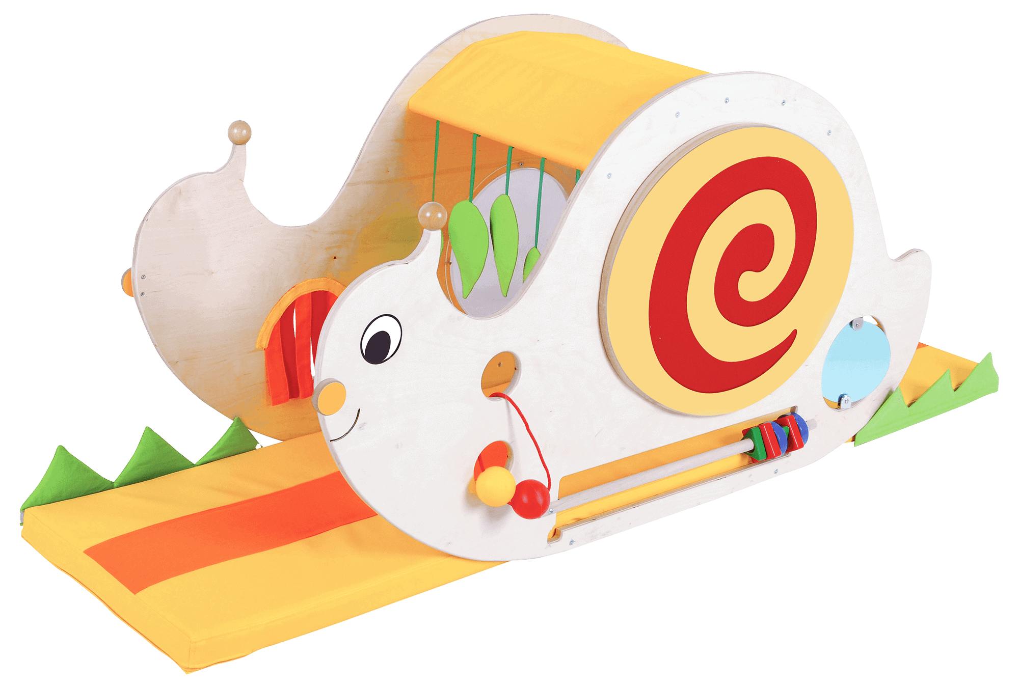 Snegl i træ og laminat, med flere forskellige sansemotoriskeelementer. og en blød madras i bunden.