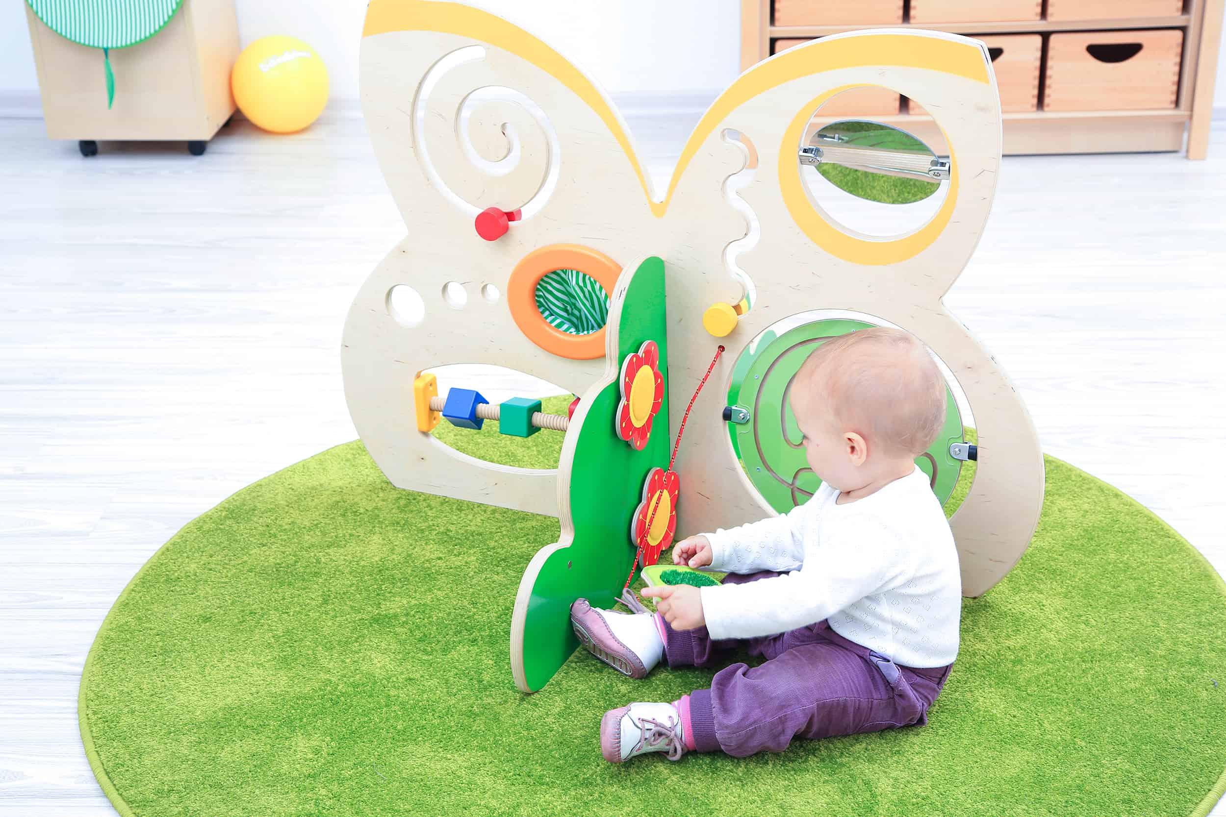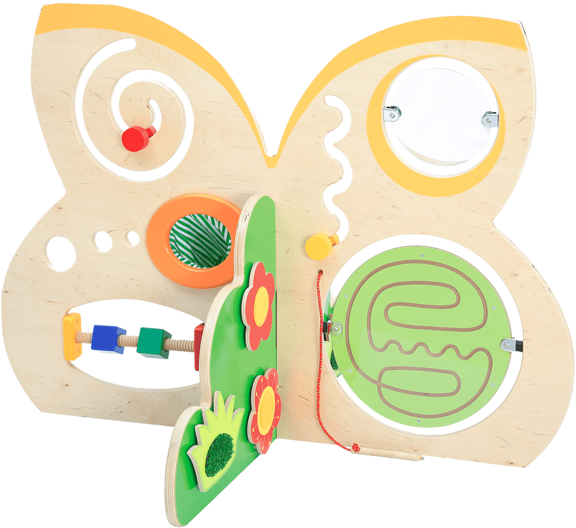 Sommerfugl i træ og laminat, med flere forskellige sansemotoriskeelementer. Kan bruges af børn fra 2 børn og opefter.