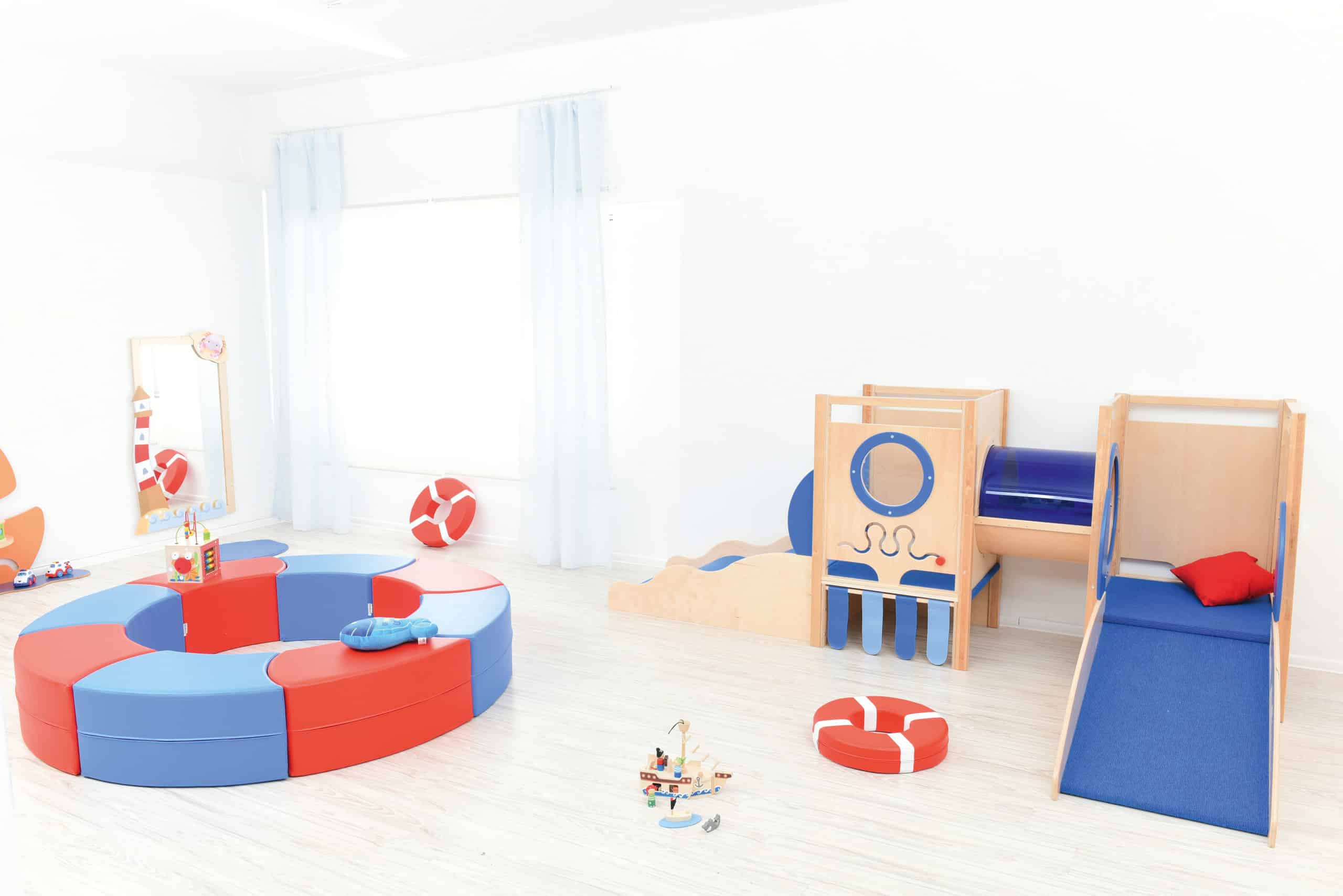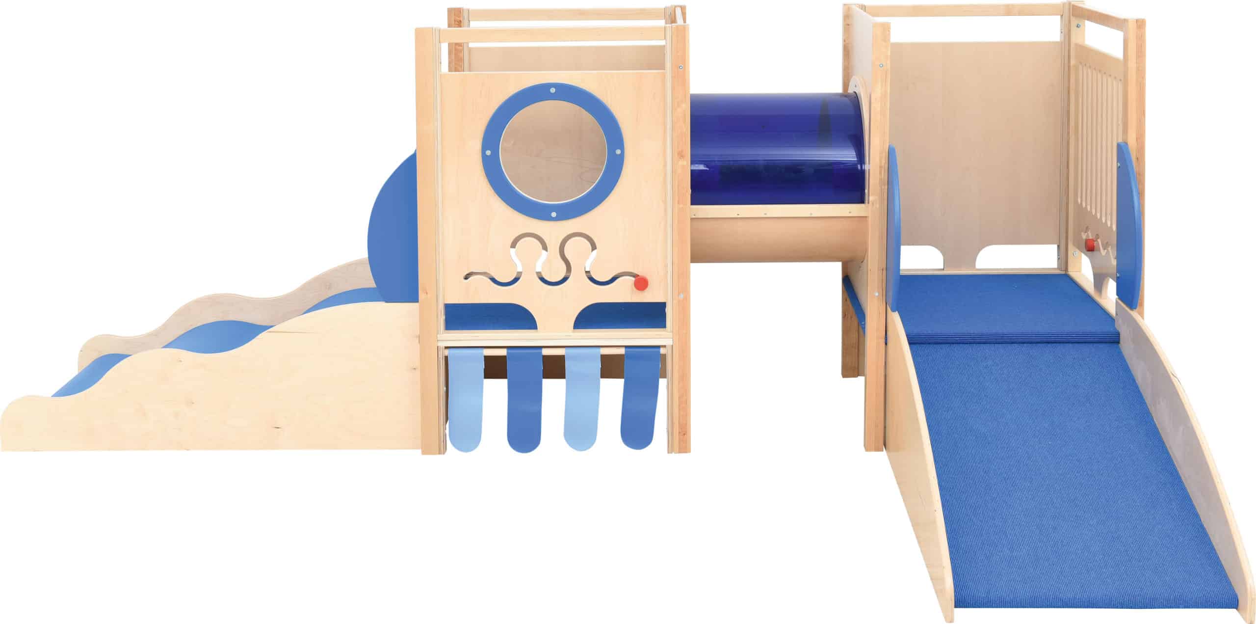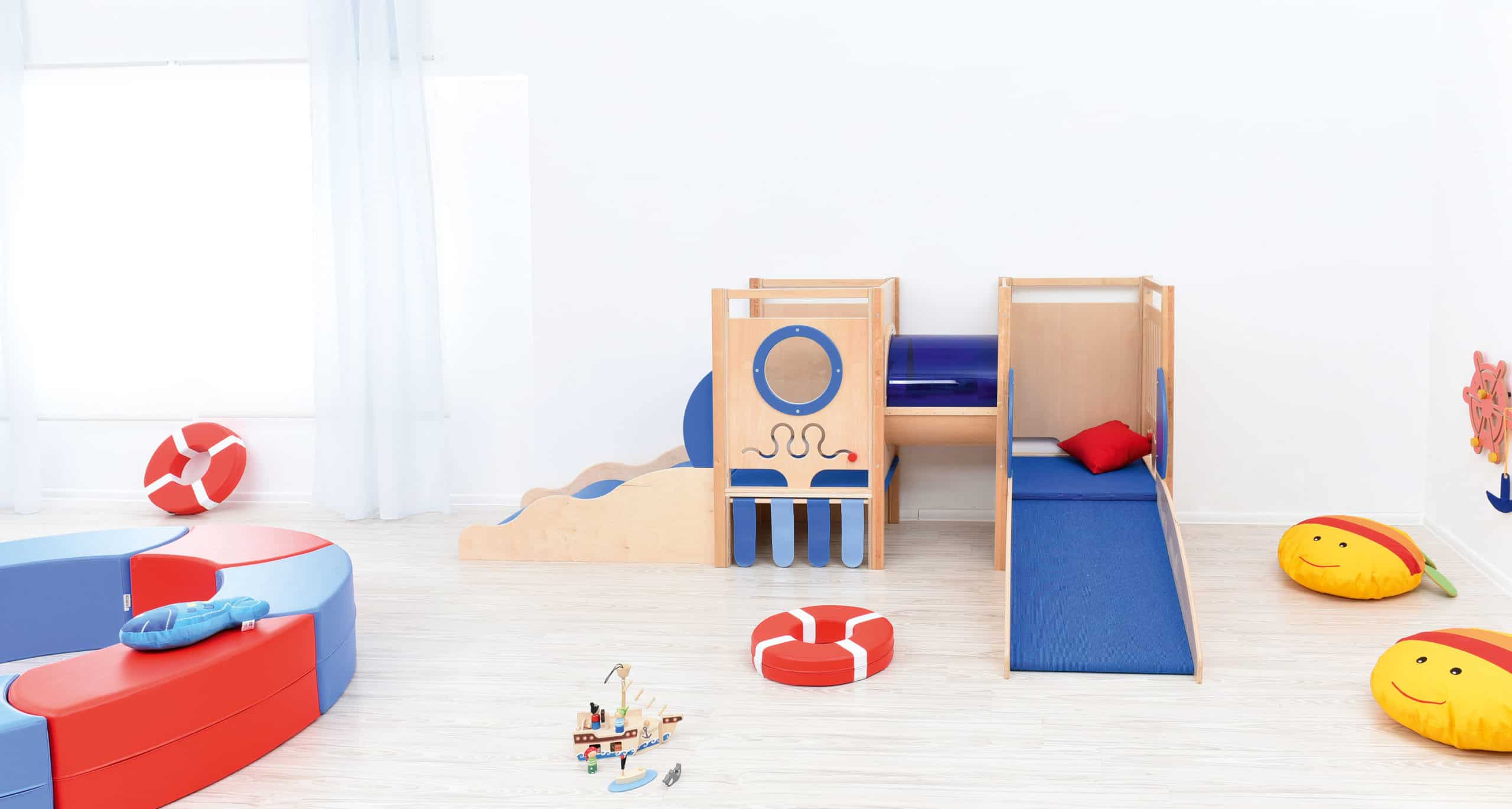 Stort legehjørne med maritimt tema. Lavet i laminat og finér. Alle platforme er beklædt med skridsikkert tæppe. Rutschebanen er beklædt vinyl og blødt skum.