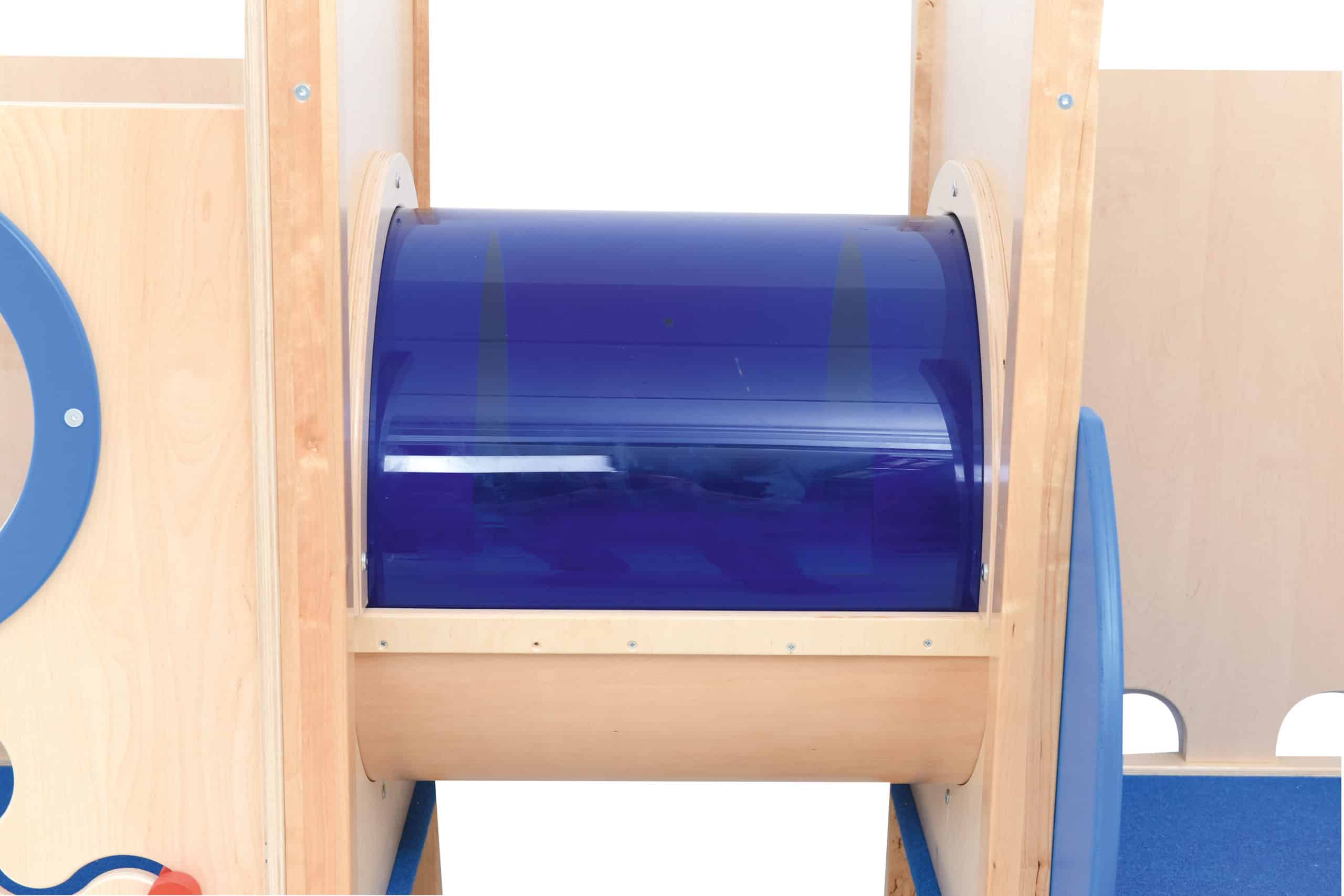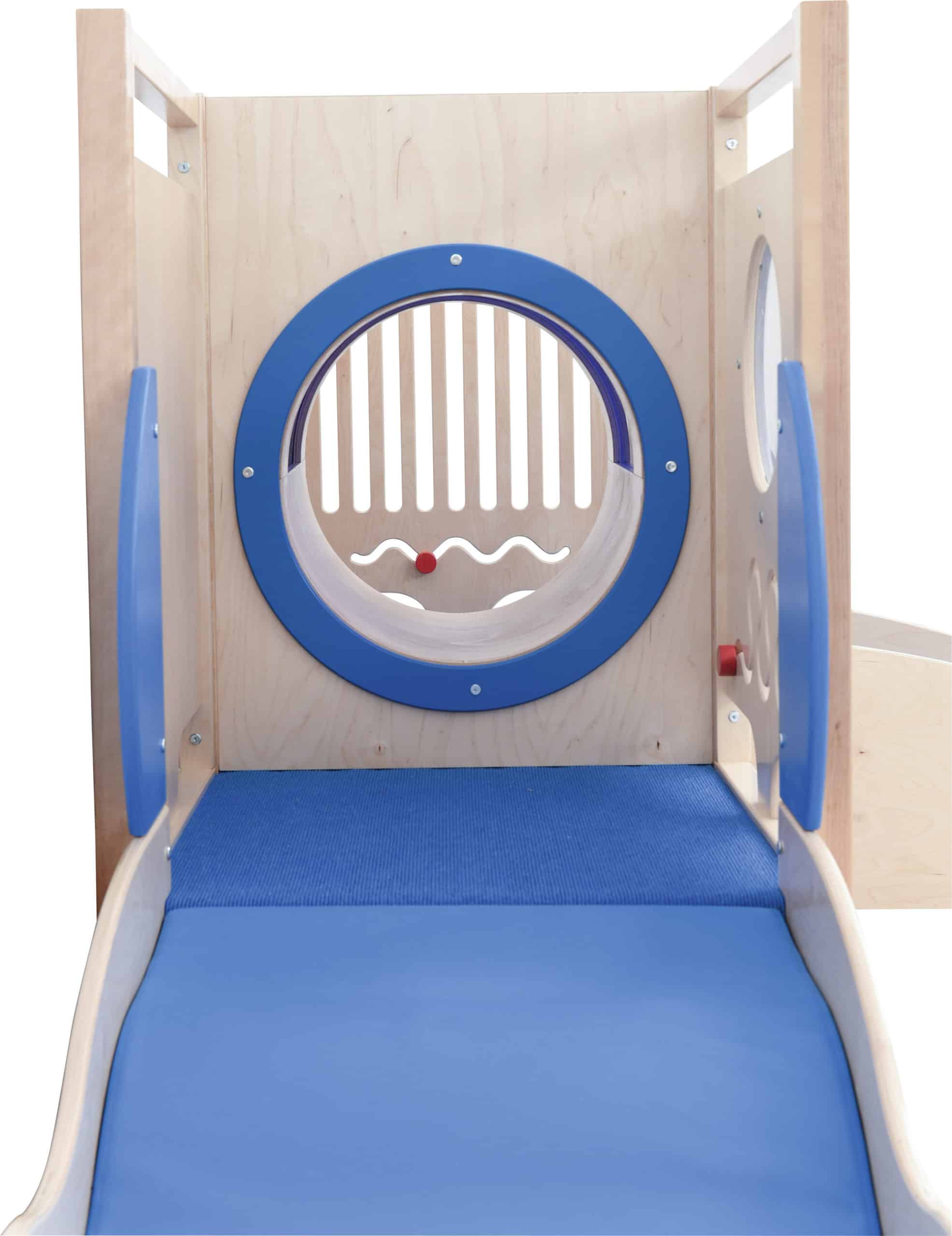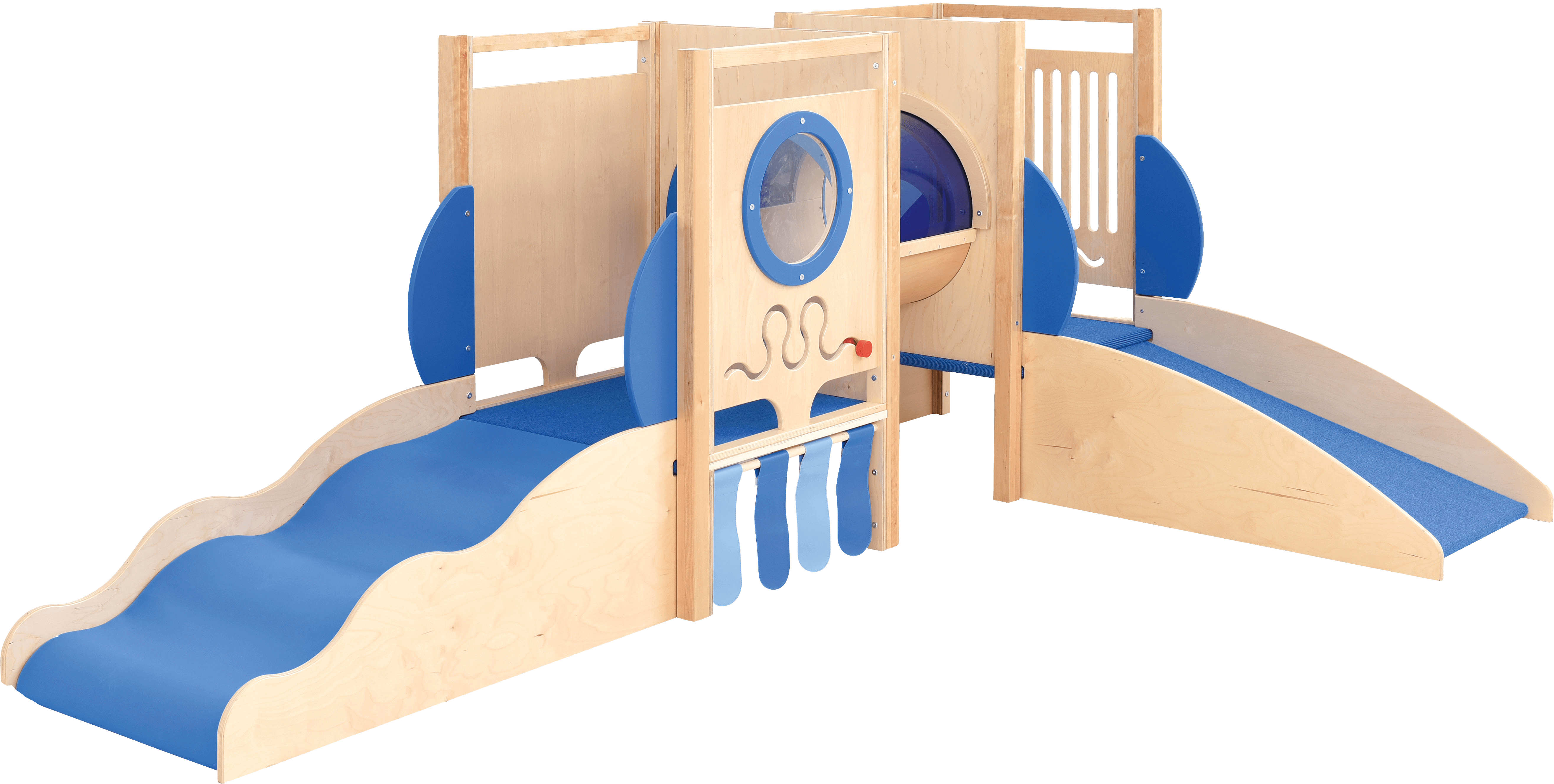 Stort legehjørne med maritimt tema. Lavet i laminat og finér. Alle platforme er beklædt med skridsikkert tæppe. Rutschebanen er beklædt vinyl og blødt skum.