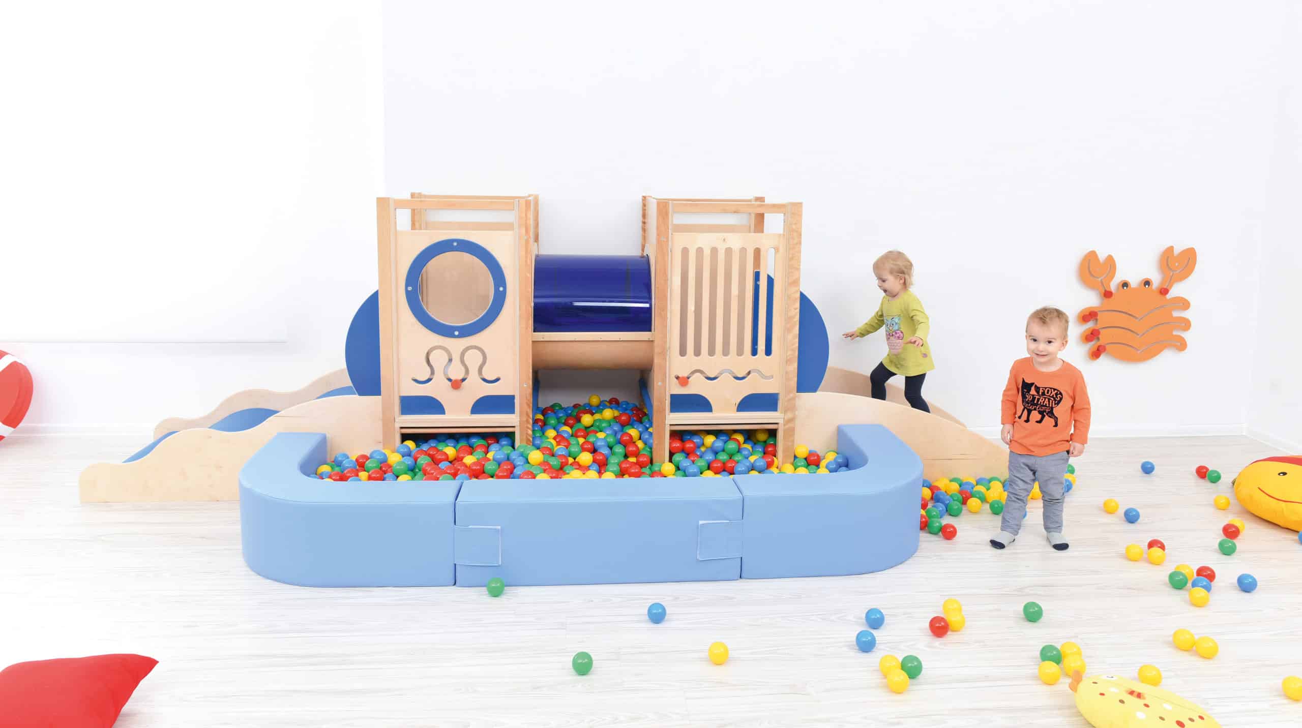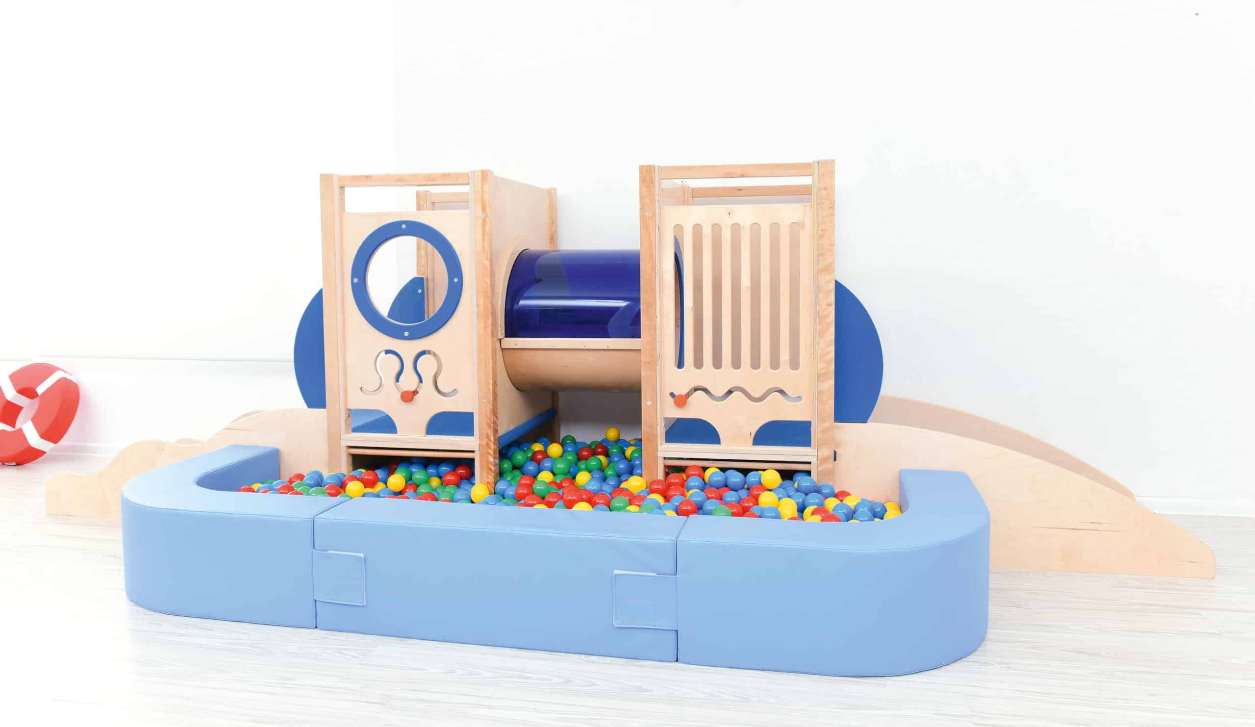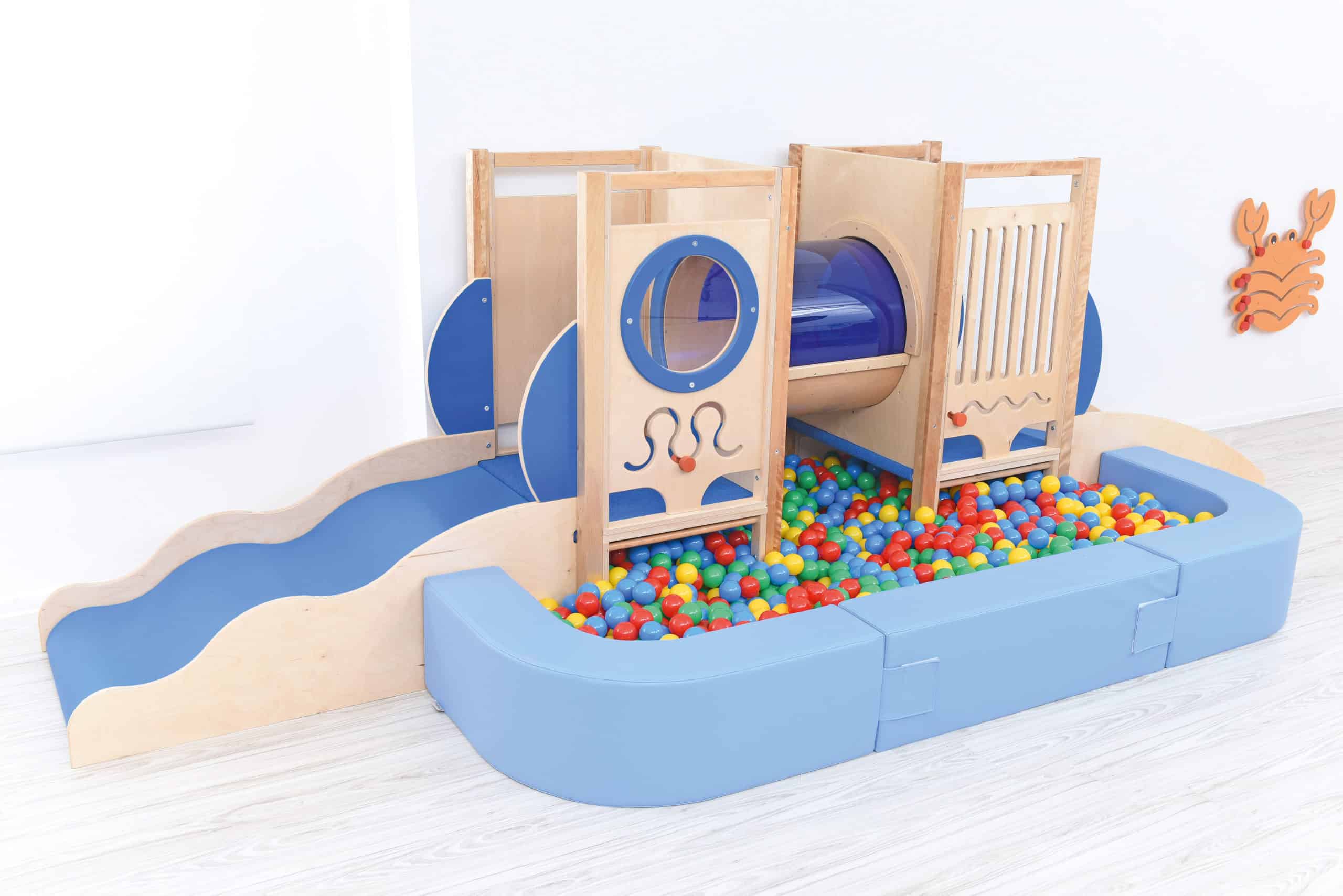 Stort legehjørne med maritimt tema. Lavet i laminat og finér. Alle platforme er beklædt med skridsikkert tæppe. Rutschebanen er beklædt vinyl og blødt skum. Boldbassinet kanter er ligeledes lavet i vinyl og skum. Der medfølger 2000 farve bolde. Bemærk – legehjørnet skal stå op af en væg!