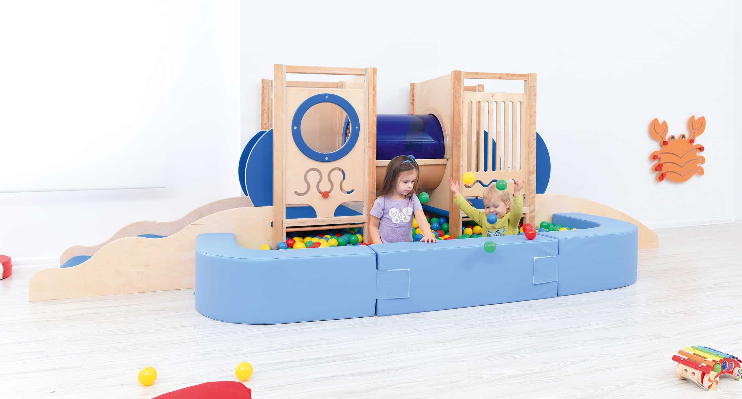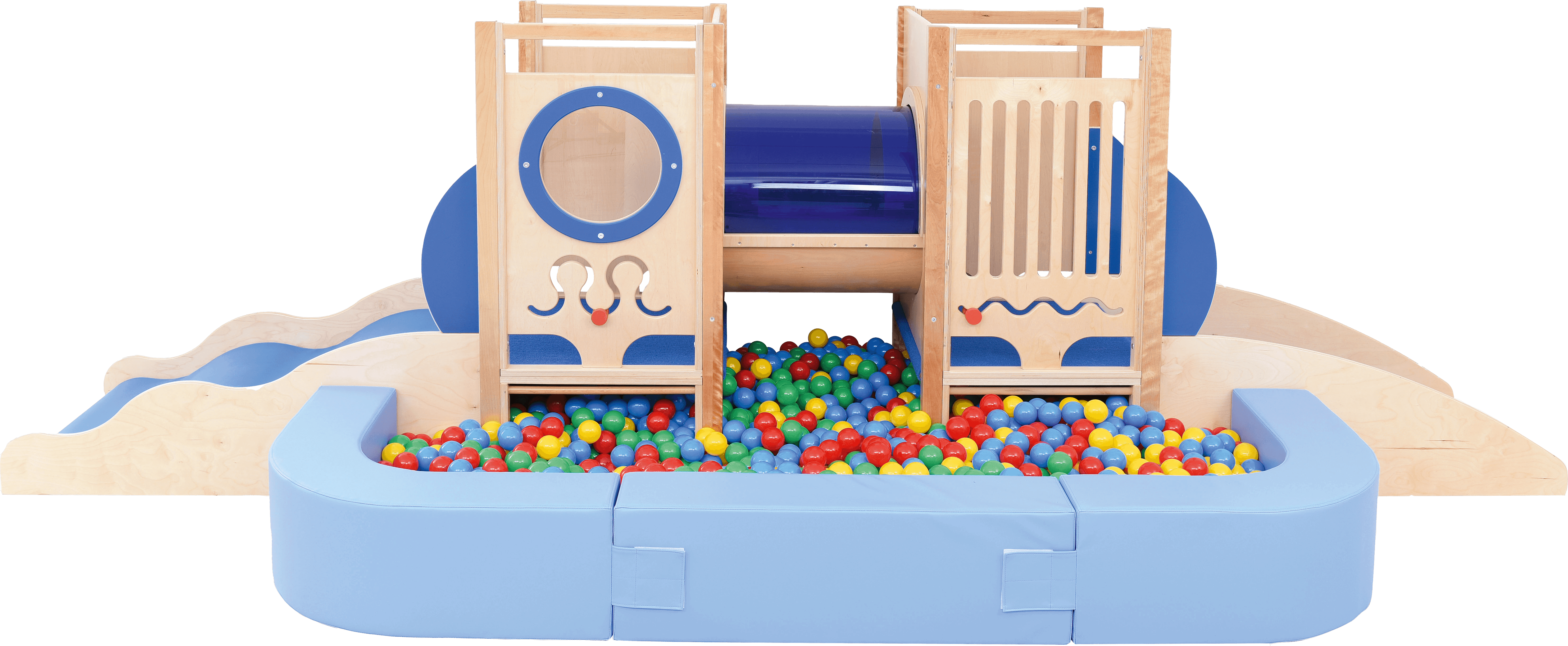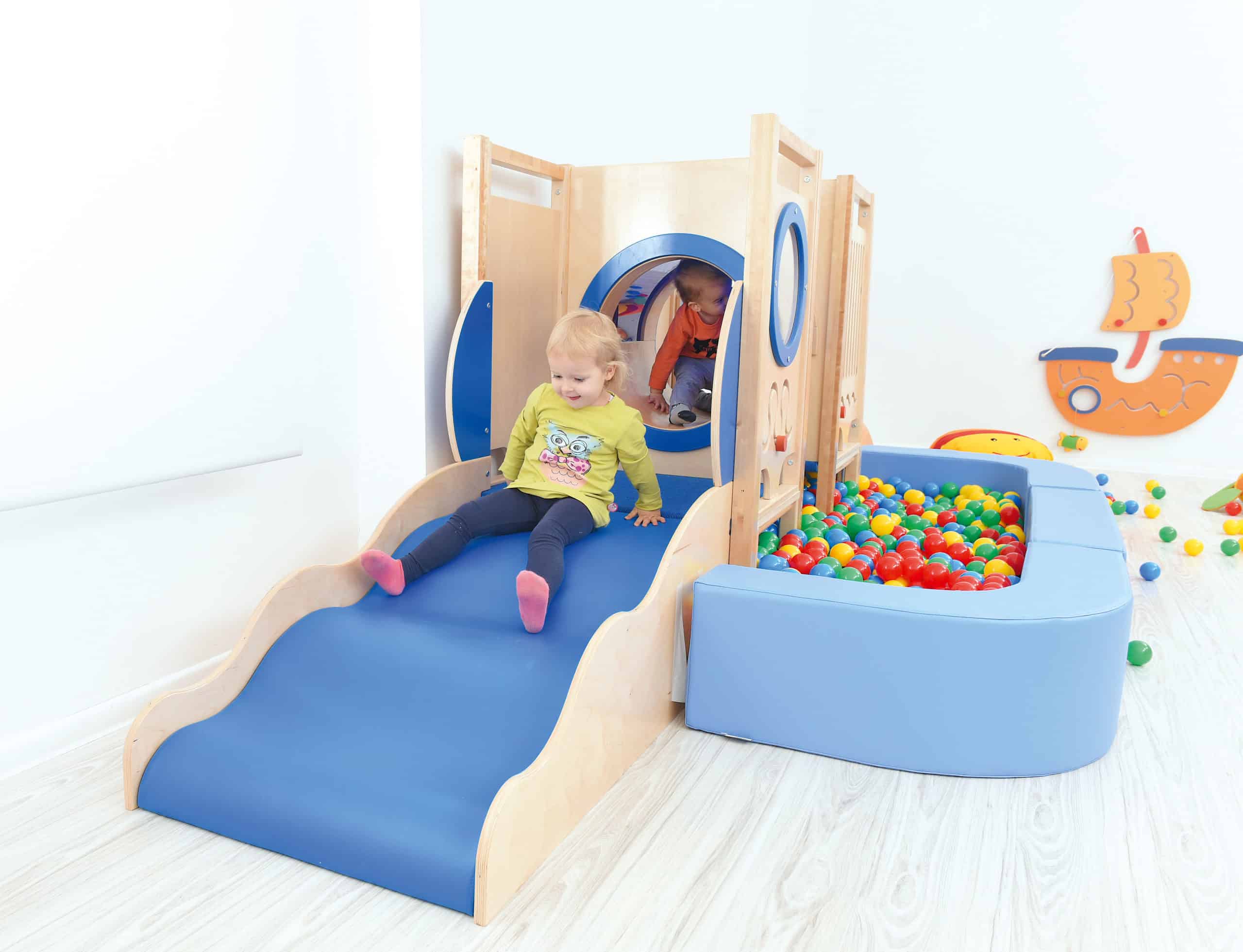 Stort legehjørne med maritimt tema. Lavet i laminat og finér. Alle platforme er beklædt med skridsikkert tæppe. Rutschebanen er beklædt vinyl og blødt skum. Boldbassinet kanter er ligeledes lavet i vinyl og skum. Der medfølger 2000 farve bolde. Bemærk – legehjørnet skal stå op af en væg!