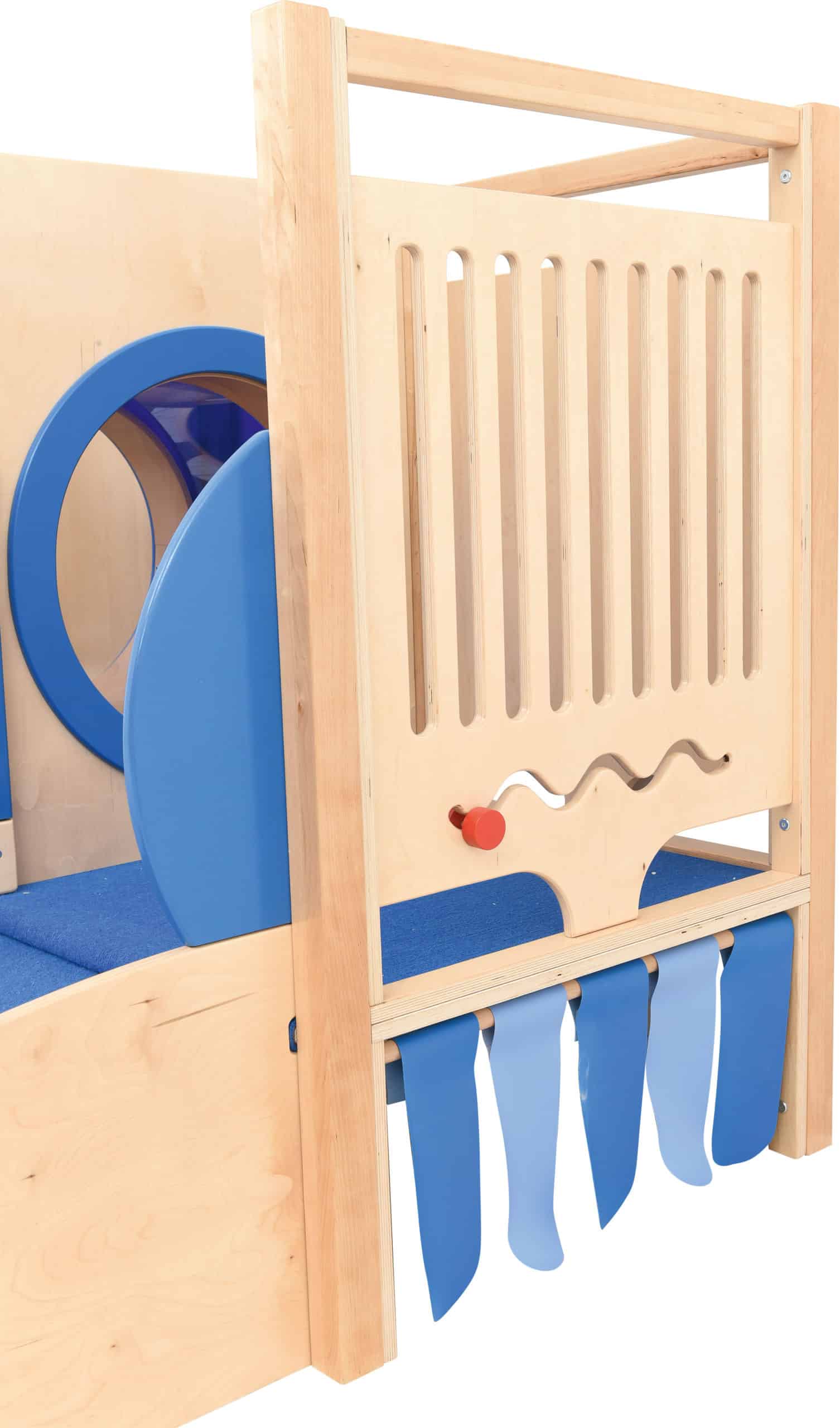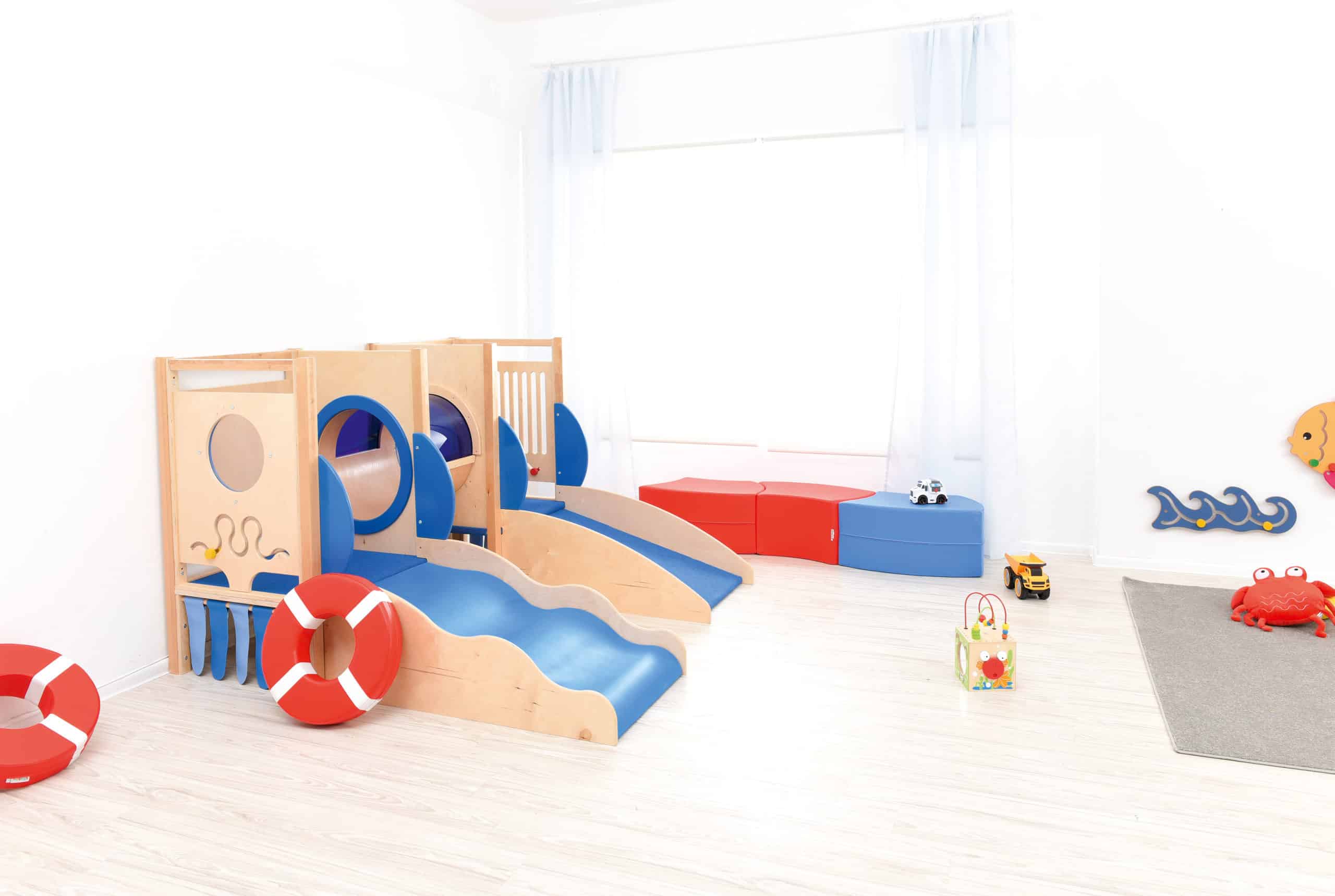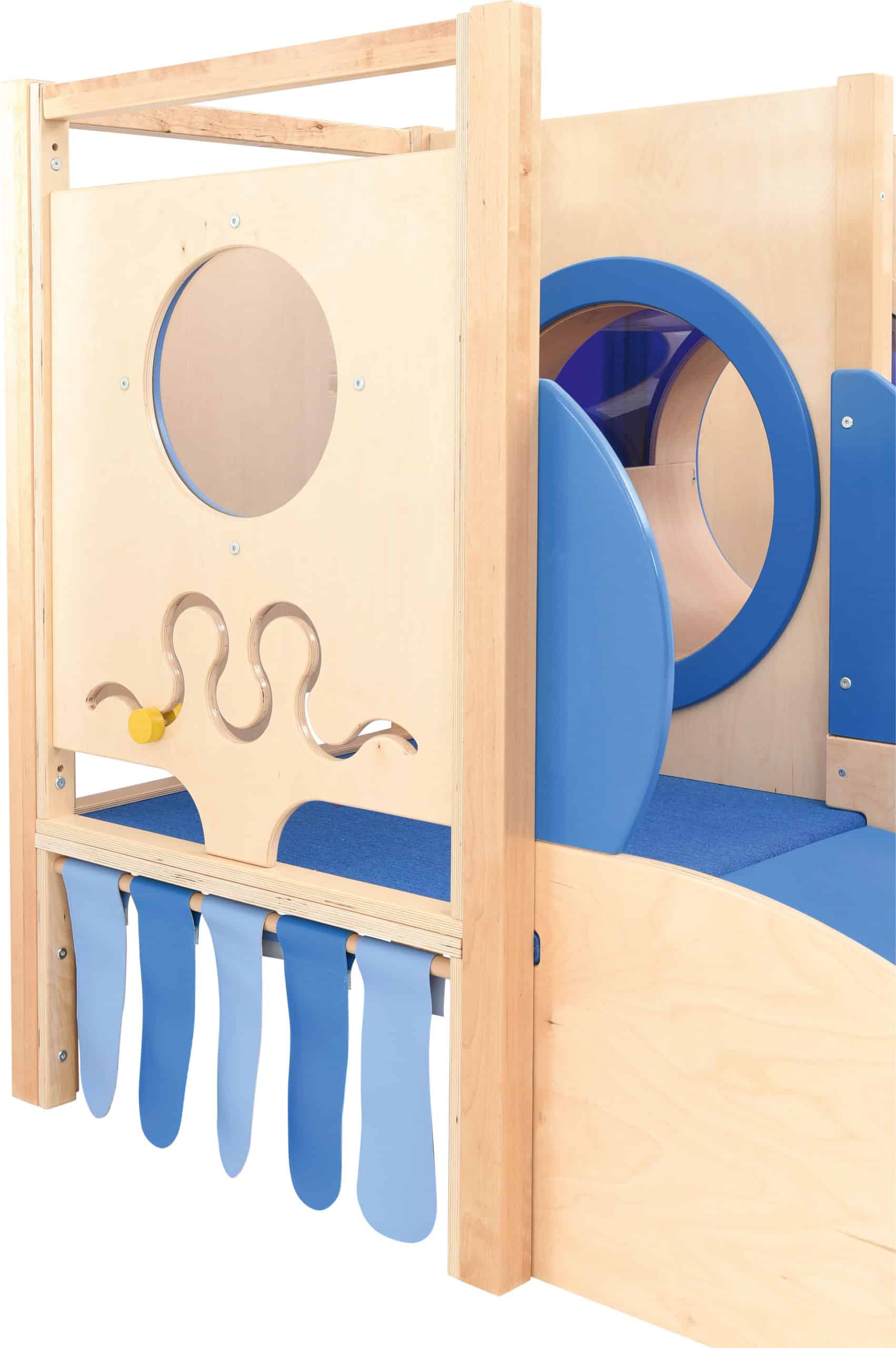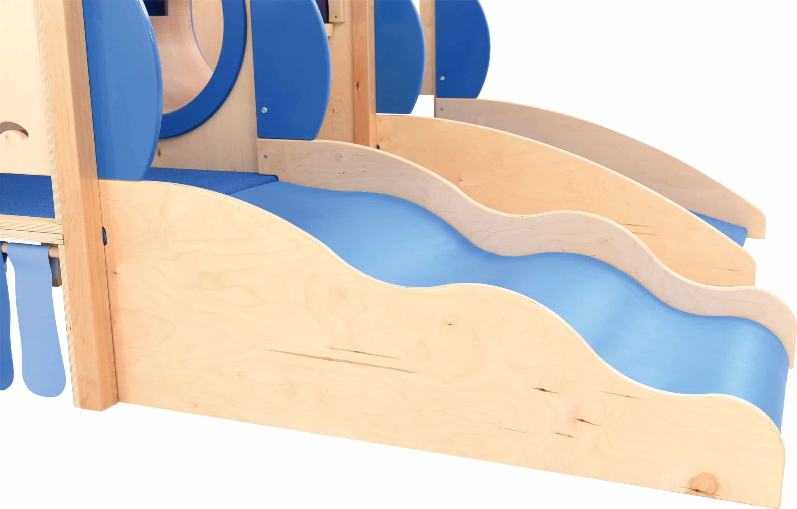 Stort legehjørne med maritimt tema. Lavet i laminat og finér. Alle platforme er beklædt med skridsikkert tæppe. Rutschebanen er beklædt vinyl og blødt skum.