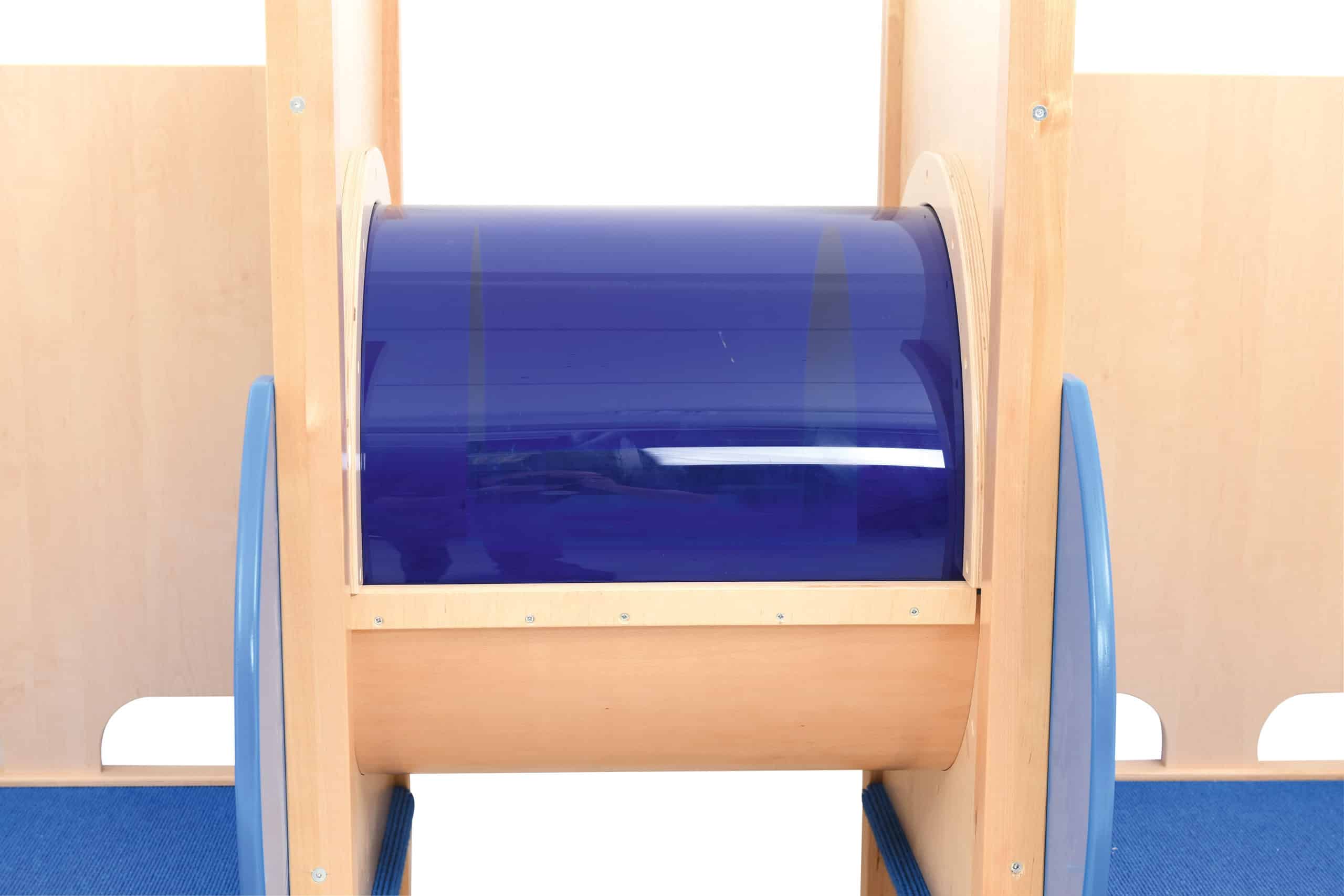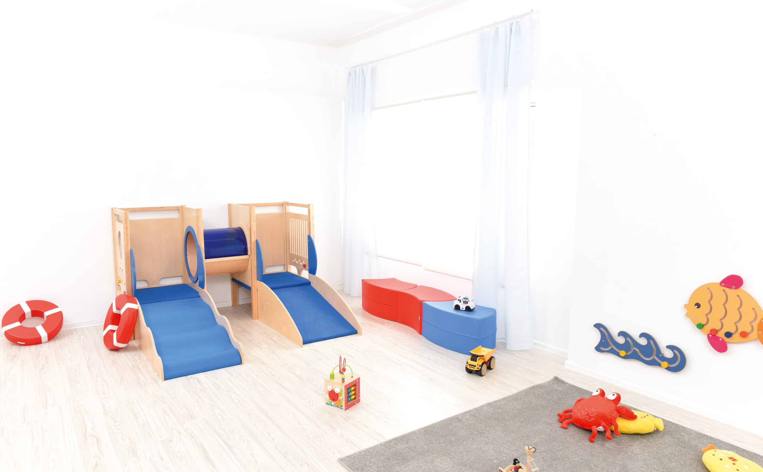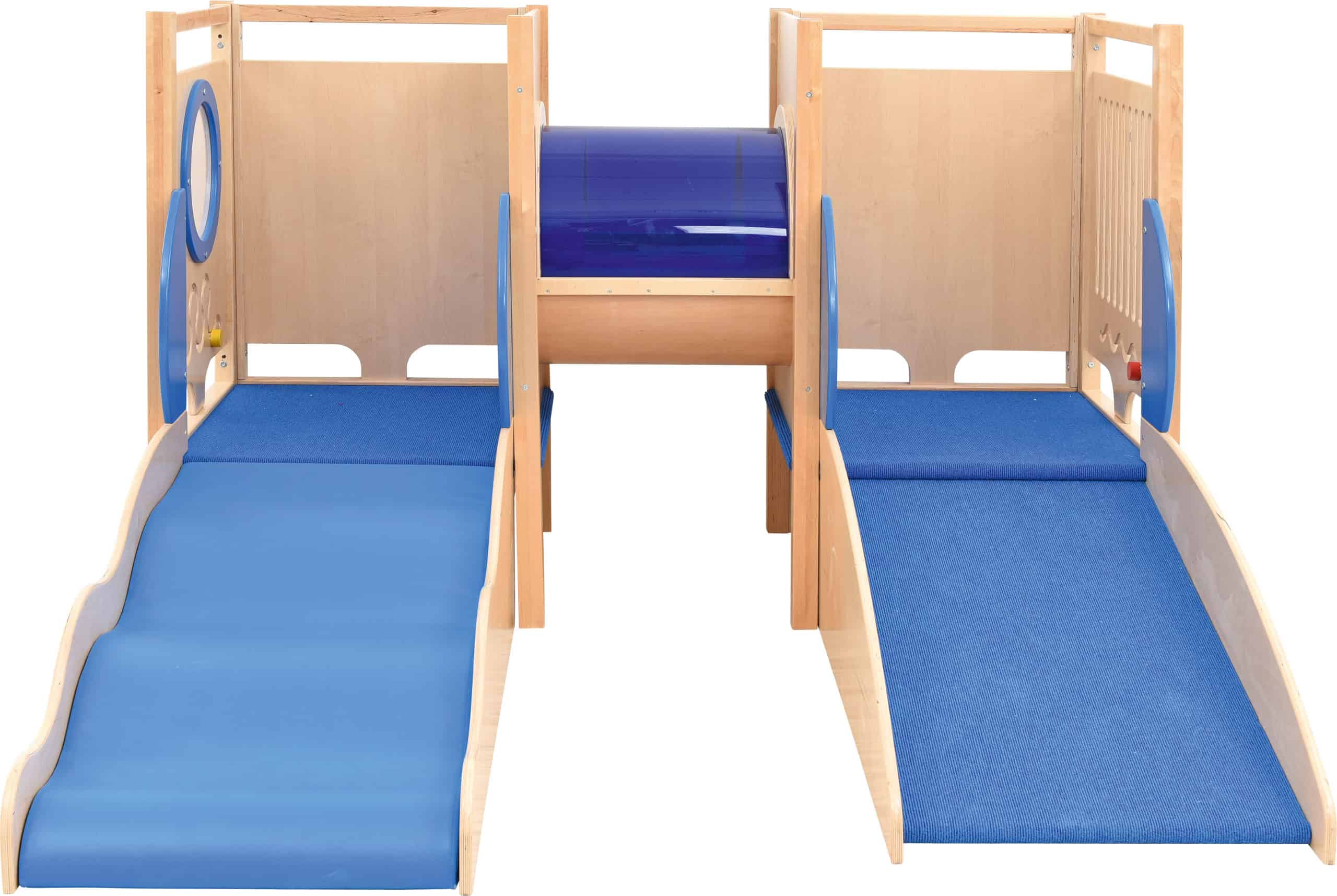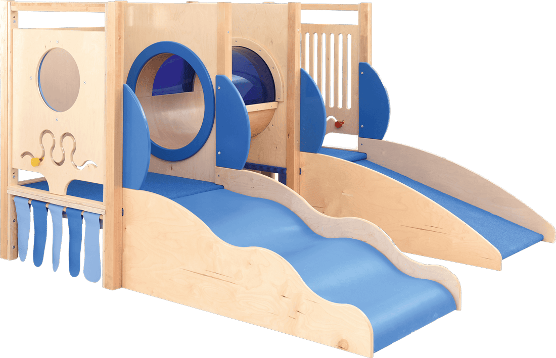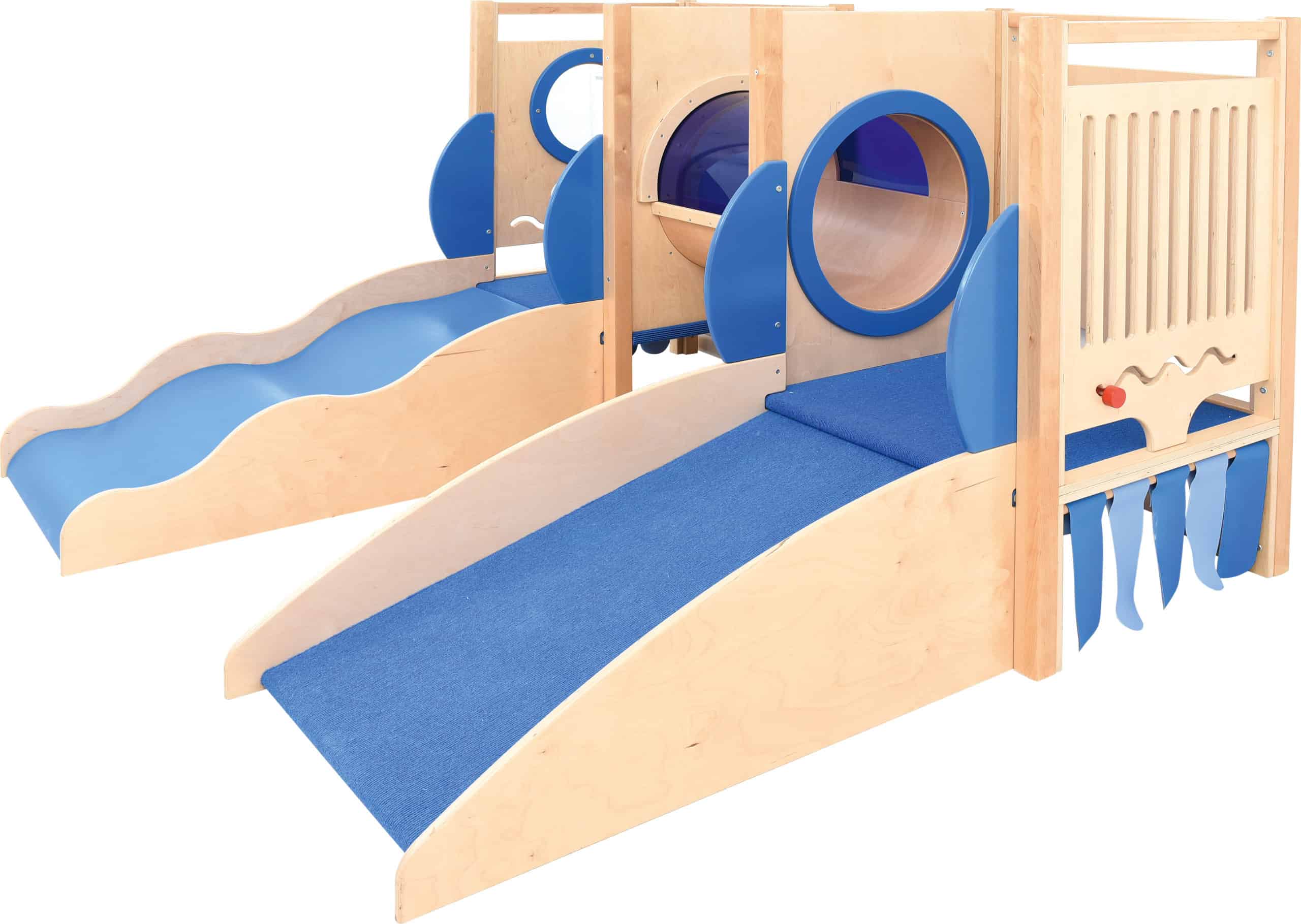Stort legehjørne med maritimt tema. Lavet i laminat og finér. Alle platforme er beklædt med skridsikkert tæppe. Rutschebanen er beklædt vinyl og blødt skum.