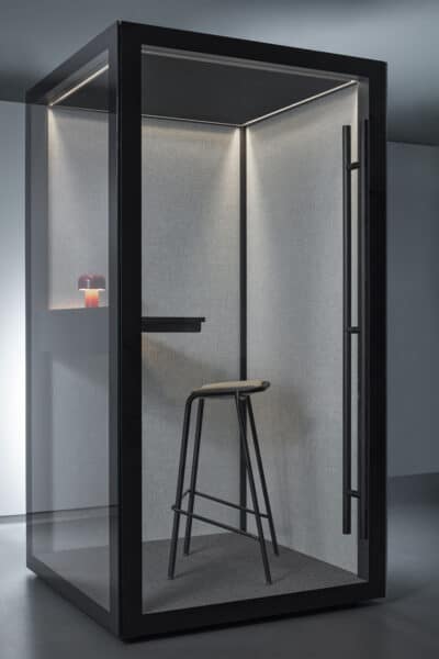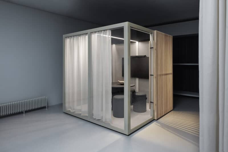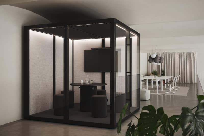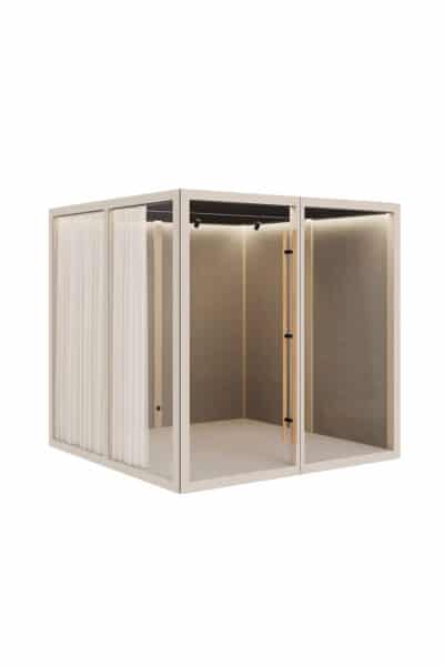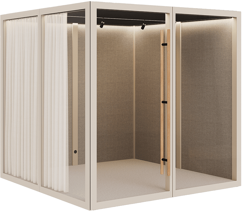 De medium Zen Pods er små mødelokaler, stille rum, et fristed til at trække vejret. Det er et rum at trives i, elegant og sparsomt designet med imødekommende og varme materialer som træ og uldne tekstiler i kombination med glas, aluminium og stål. Her kan i opholde jer op 2-4 personer ad gangen. Beregnet til at fungere som et mødelokale eller stille arbejdsplads.