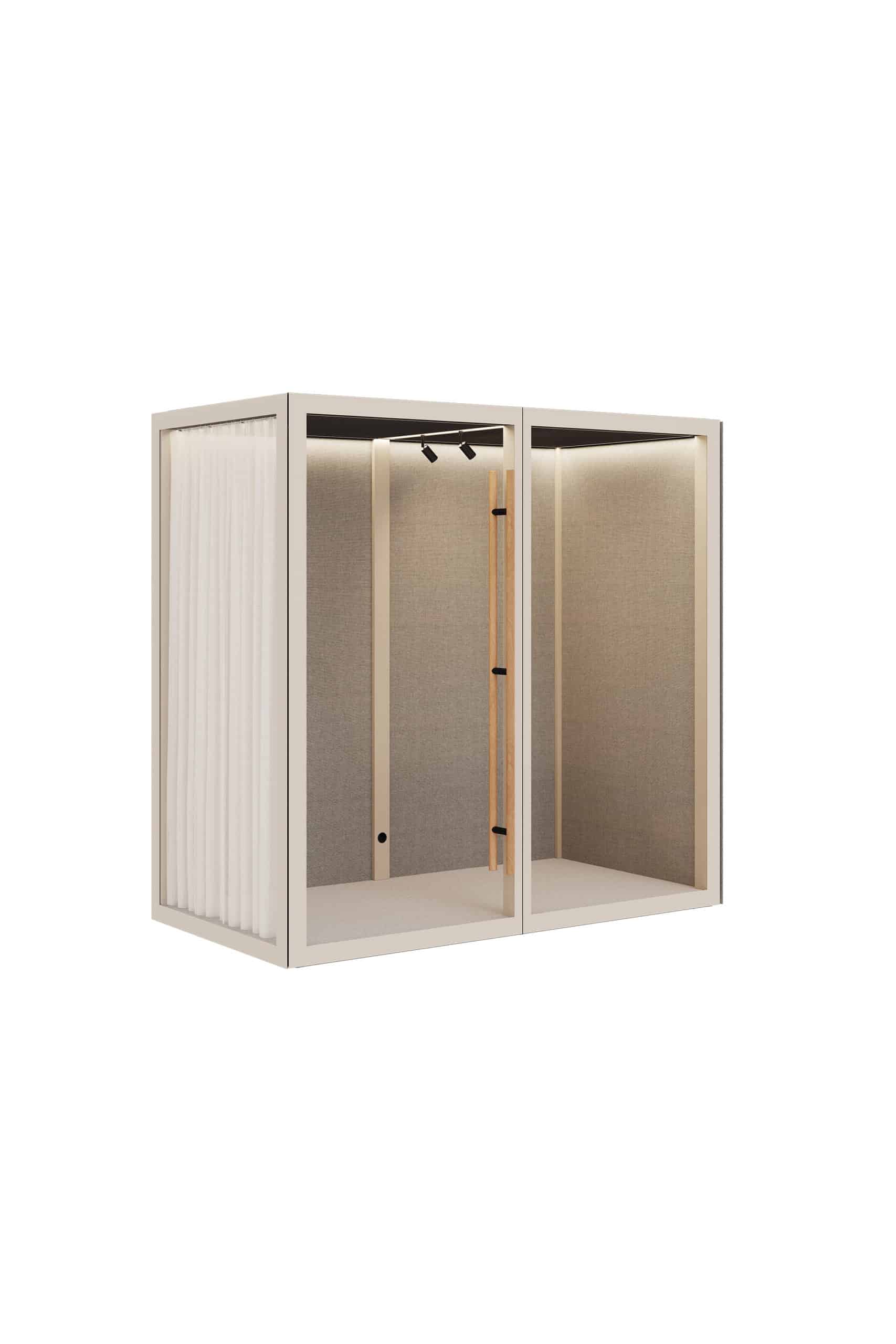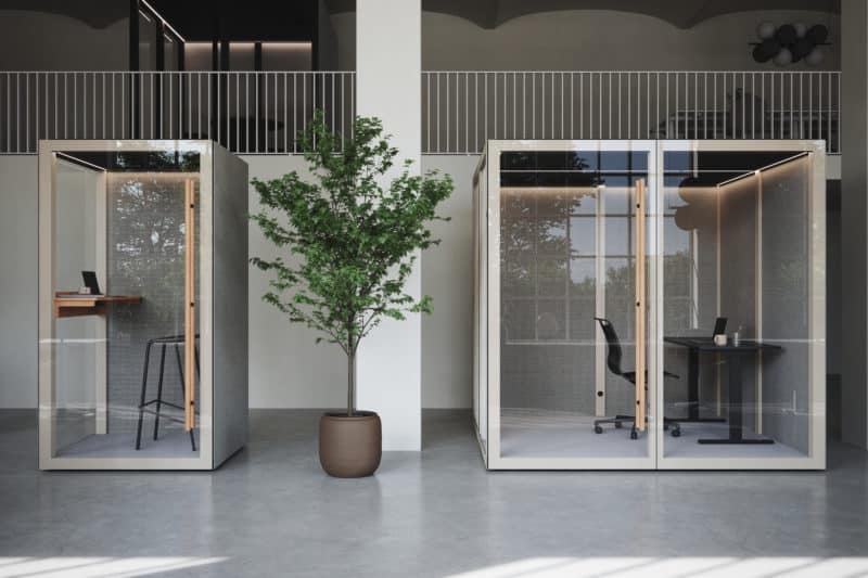 De medium Zen Pods er små mødelokaler, stille rum, et fristed til at trække vejret. Zen Pod byder på meget mere end stilhed. Det er et rum at trives i, elegant og sparsomt designet med imødekommende og varme materialer som træ og uldne tekstiler i kombination med glas, aluminium og stål. Her kan i opholde jer op til to til en snak i stille omgivelser.